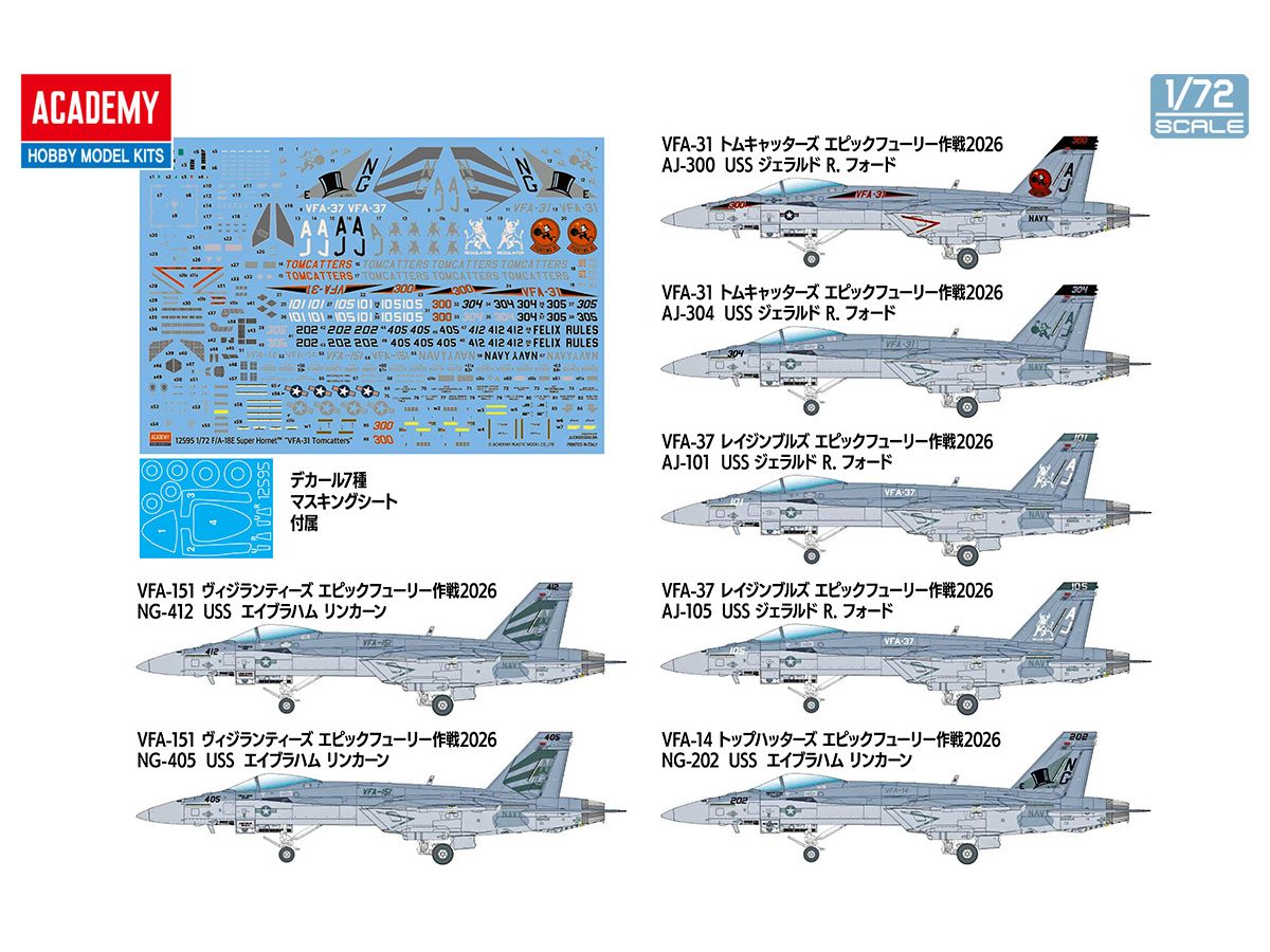 "エピック・フューリー作戦"に参加したVFA-31 トムキャッターズを含む新規デザインデカール7種類とキャノピーマスキングステッカーが付属しています。