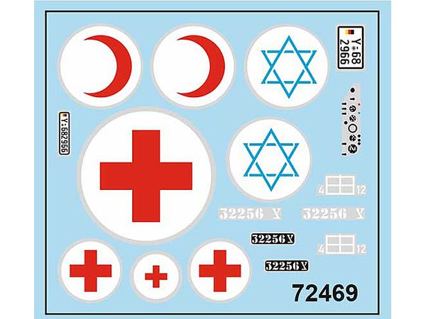 キットには3種デカール(ドイツ軍、イスラエル軍、チュニジア軍 x 各1)が付属しています。