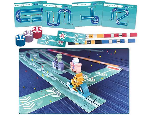 スピードの速いボートやコーナーに強いボートなど、全6種類の中から好きなボートを選び、スピードや曲がる角度が異なるカードをコースに合わせてうまくつなぎ自分のコマを走らせます。
