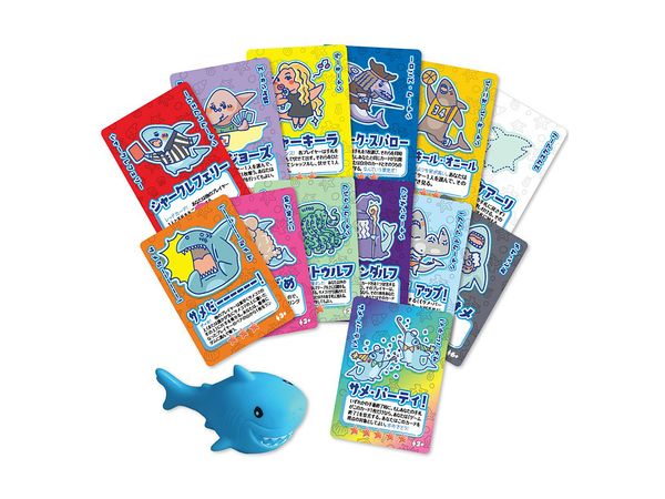 手札を1枚奪ったり、他のプレイヤー1人と丸ごと手札を交換したり、欲しいカードに向かってサメコマを投げたりと、12種類のトンデモ効果で場を混乱させます。