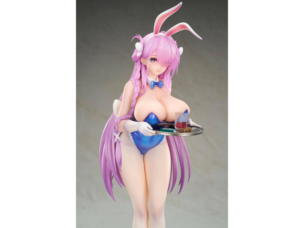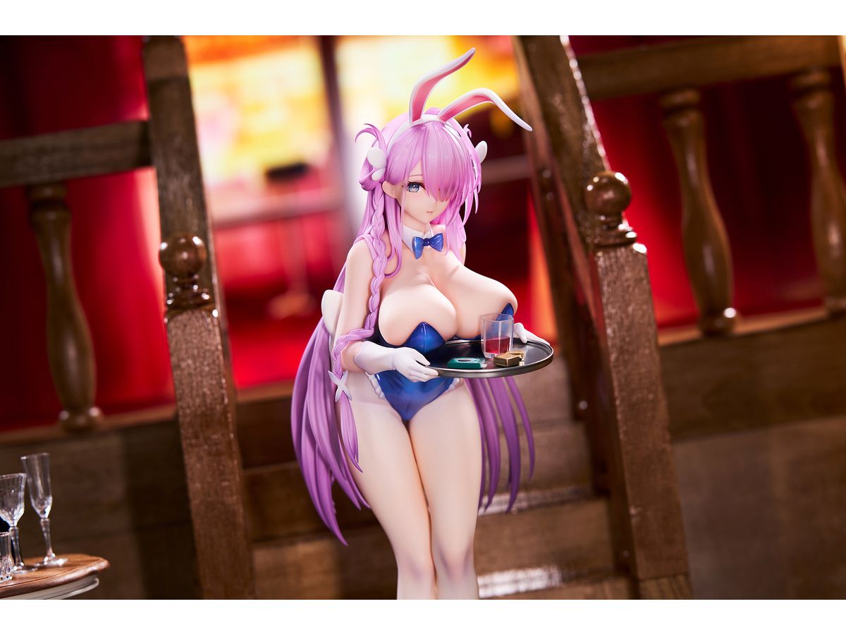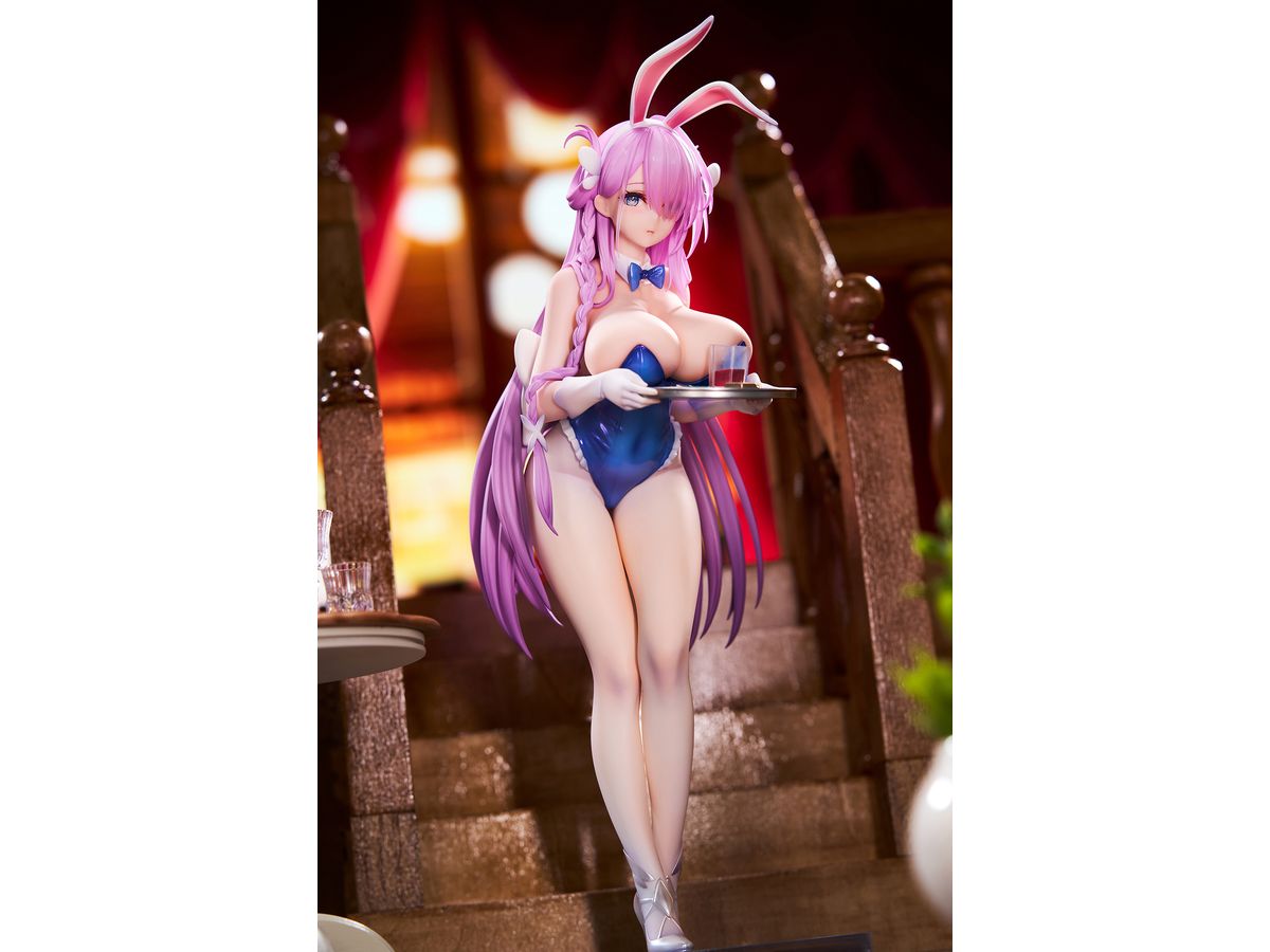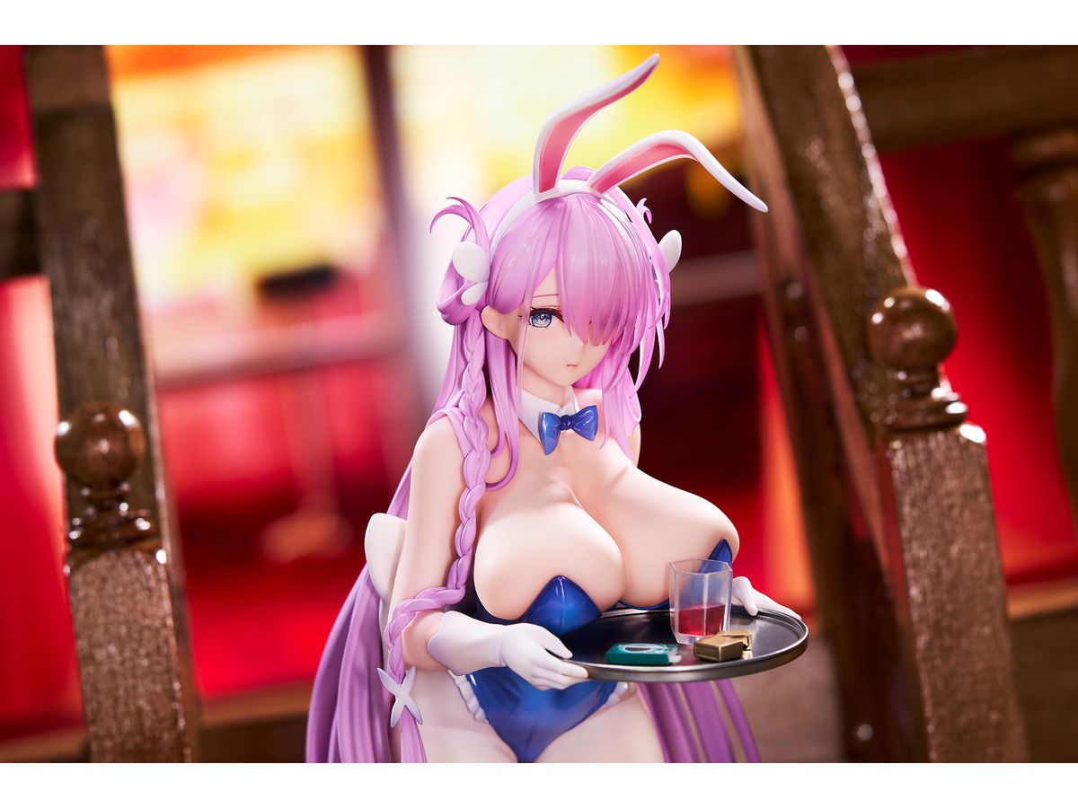 愛らしいウサ耳を頭に乗せ、淡い紫色のロングヘアが肩へと自然に流れ落ち、頬をかすめる前髪は、どこか艶めいた表情を引き立てます。
