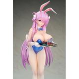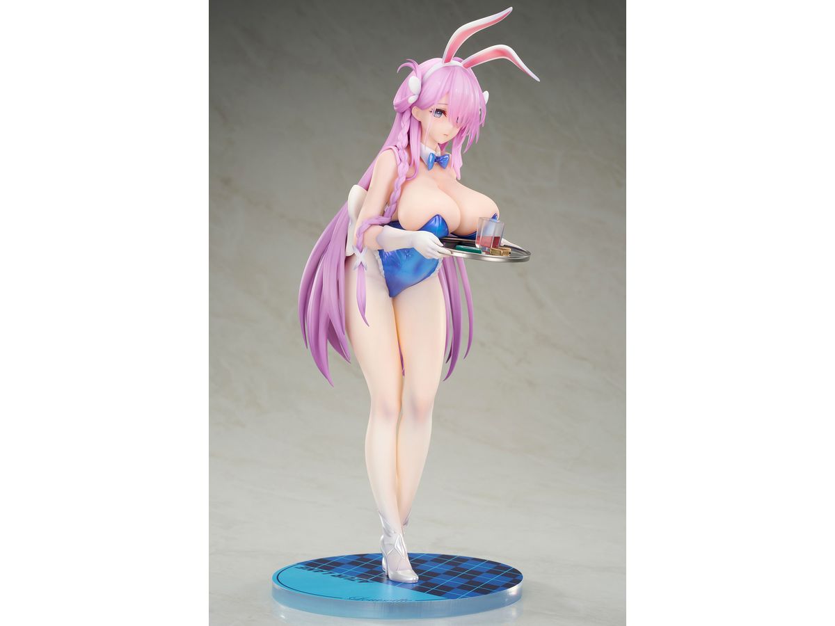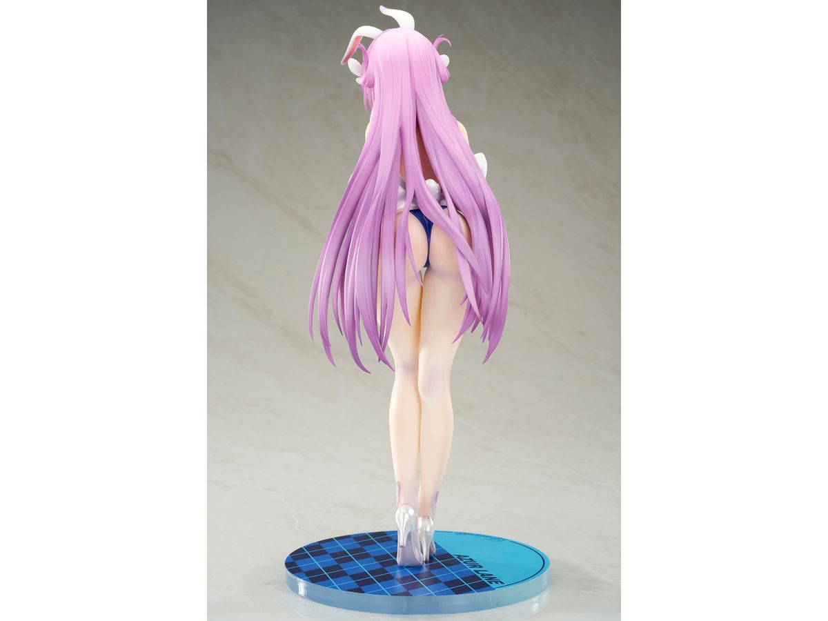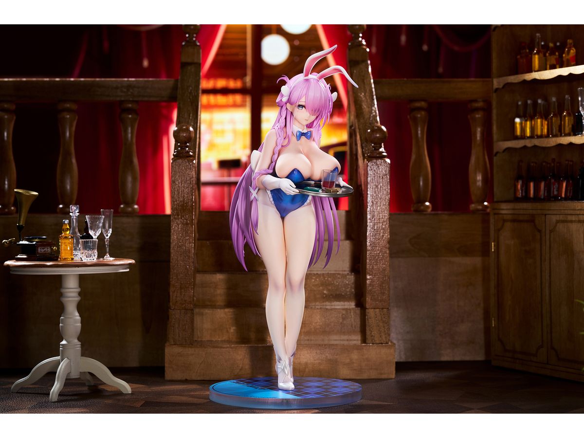 愛らしいウサ耳を頭に乗せ、淡い紫色のロングヘアが肩へと自然に流れ落ち、頬をかすめる前髪は、どこか艶めいた表情を引き立てます。