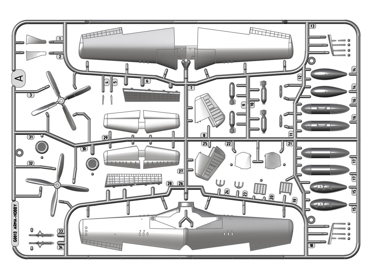 コックピット内や着陸装置格納庫など細部のディテールまでリアルに再現された本キットには、3種類のデカール(米軍ヨーロッパ戦線、米軍フィリピン戦線、イギリス空軍 x 各1)と塗装マスクシールが付属しています。