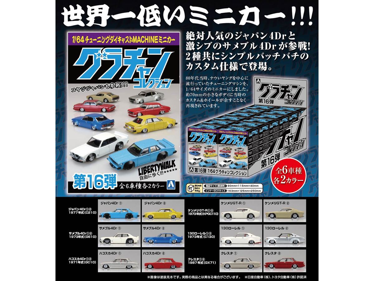 80年代当時、ナウいヤングを中心に流行っていたチューニングマシンを、1/64サイズのミニカーにしました。
