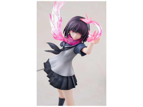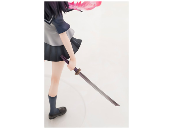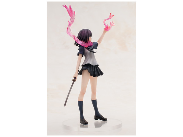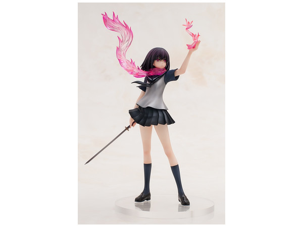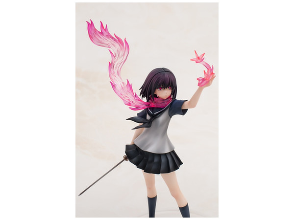 原作書籍1巻の裏表紙をモチーフに立体化された姿は、彼女と「シ・ニンジャ」独自の技「サクラ・エンハンスメント」によって具現化された桜色のマフラーメンポと炎、掲げた左手に生み出された「オリガミ・ミサイル」を見事に表現。さらに右手に持つ刀「ウバステ」はこの企画の為にわらいなく先生が新規に設定を起こしています!どことなく儚げなたたずまいでありながら瞳には桜色の炎を映し出す、絶妙の造形と色彩をご堪能ください。
