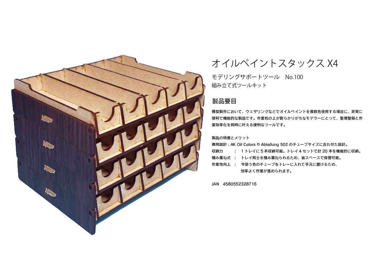 模型製作において、ウェザリングなどでオイルペイントを複数色使用する場合に、非常に便利で機能的な製品です。