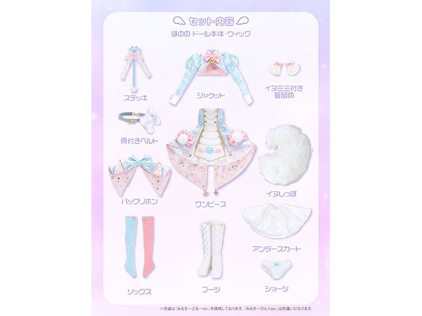 【セット内容】ほののドール本体、イヌミミ付き髪留め、ジャケット、ワンピース、バックリボン、アンダースカート、