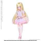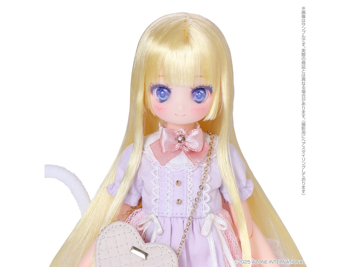 レモンカラーのきらめく金髪に、柔らかなカラーリングのメイク、そしてレンズありのライトバイオレットのアイの組み合わせが、ちっちゃなプリンセスのよう