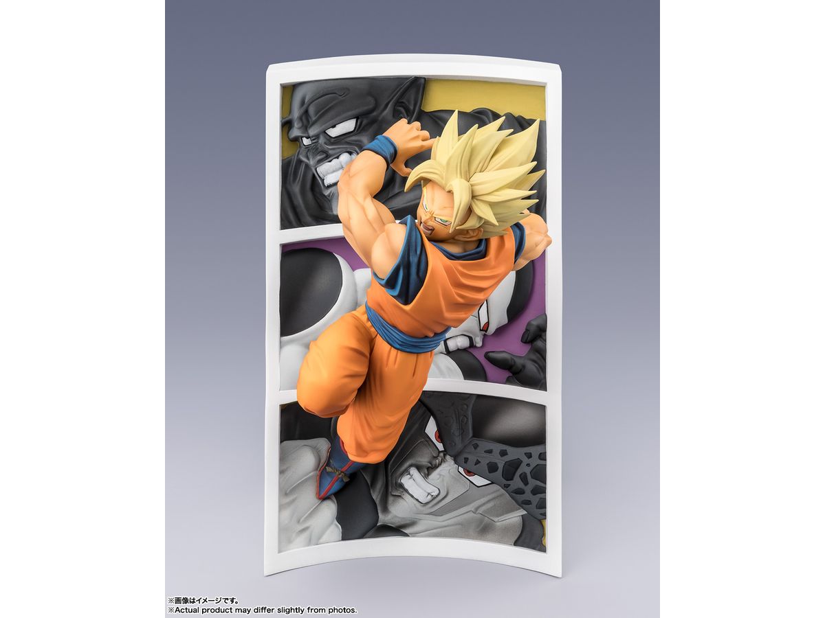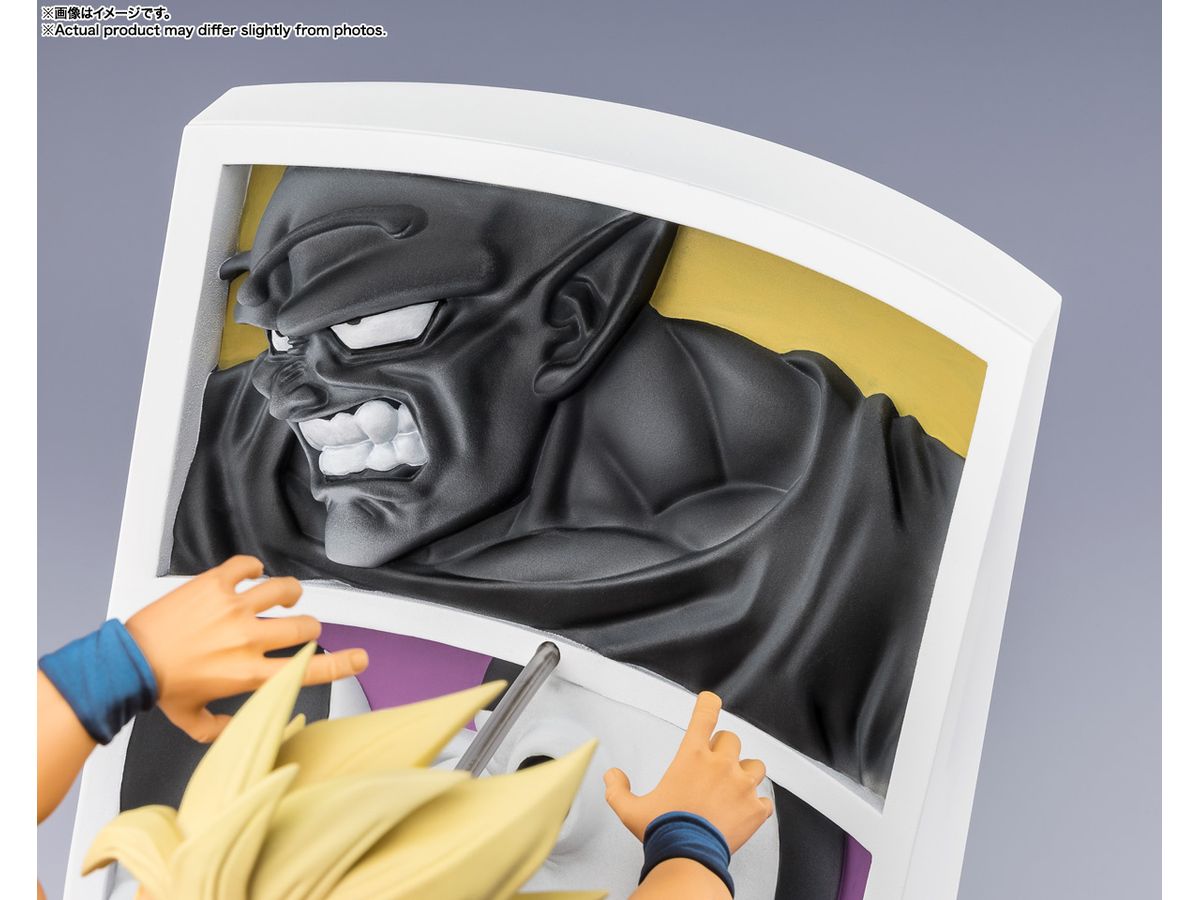悟空はもちろんのこと背景に描かれていた「ピッコロ大魔王」「フリーザ 第四形態」「セル 完全体」も半立体の台座にて再現!