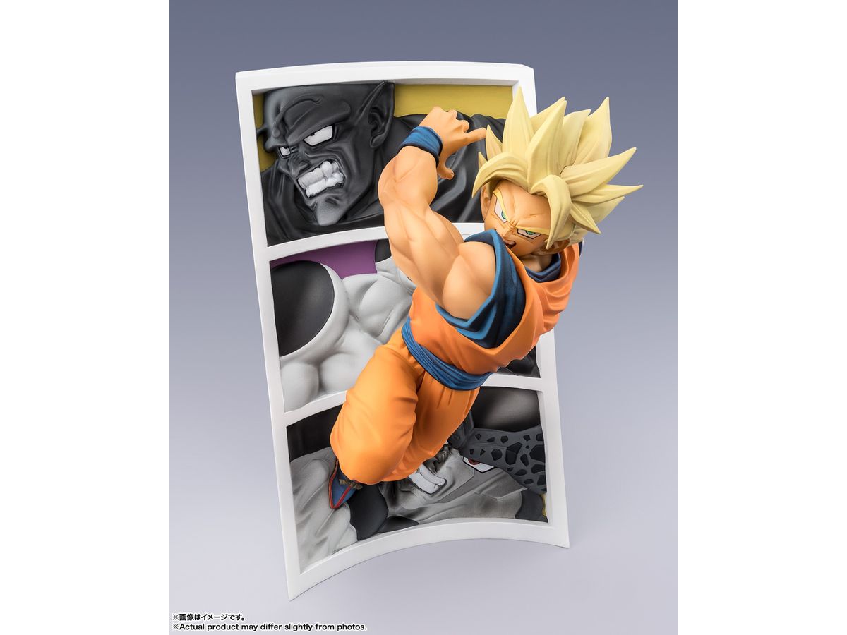 「ピッコロ大魔王」「フリーザ 第四形態」「セル 完全体」の歴代の敵たちが背景に描かれた「スーパーサイヤ人孫悟空」のイラストを立体化!