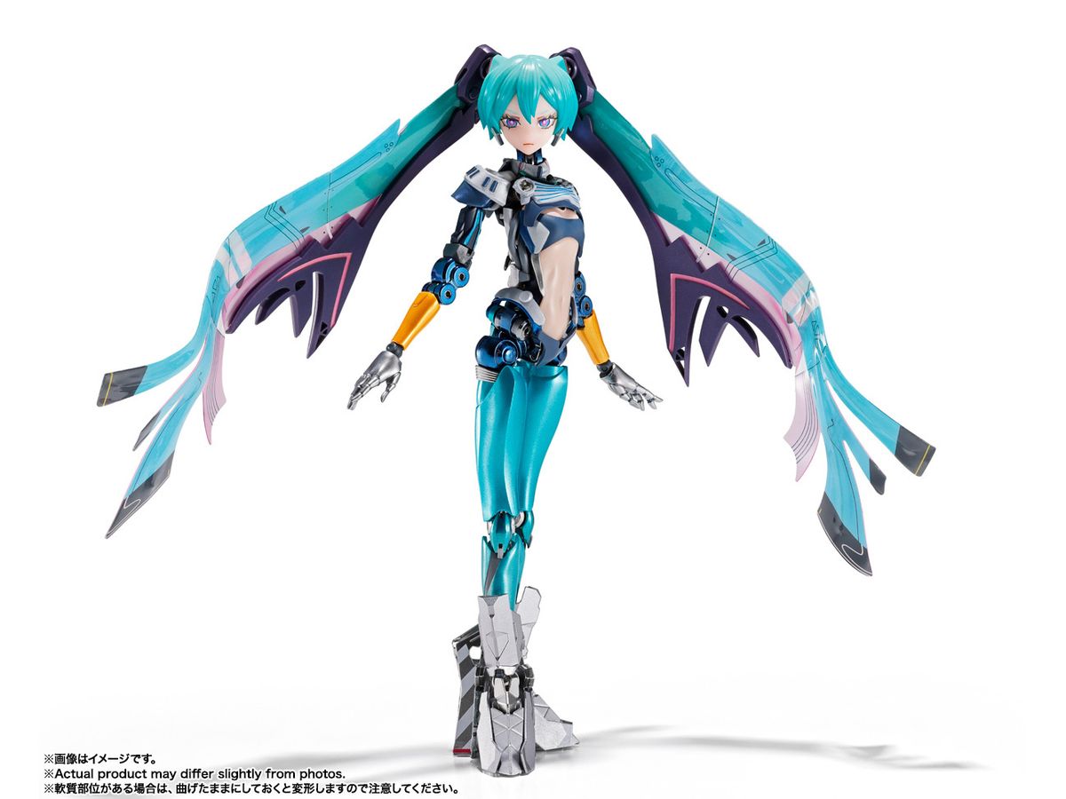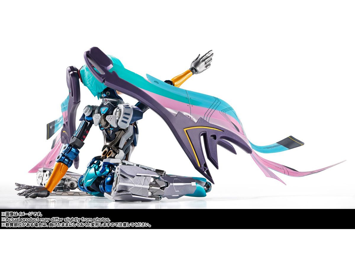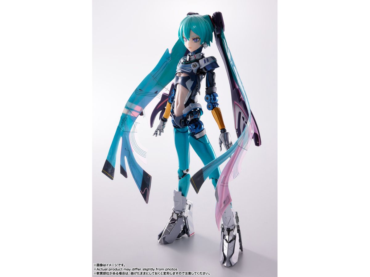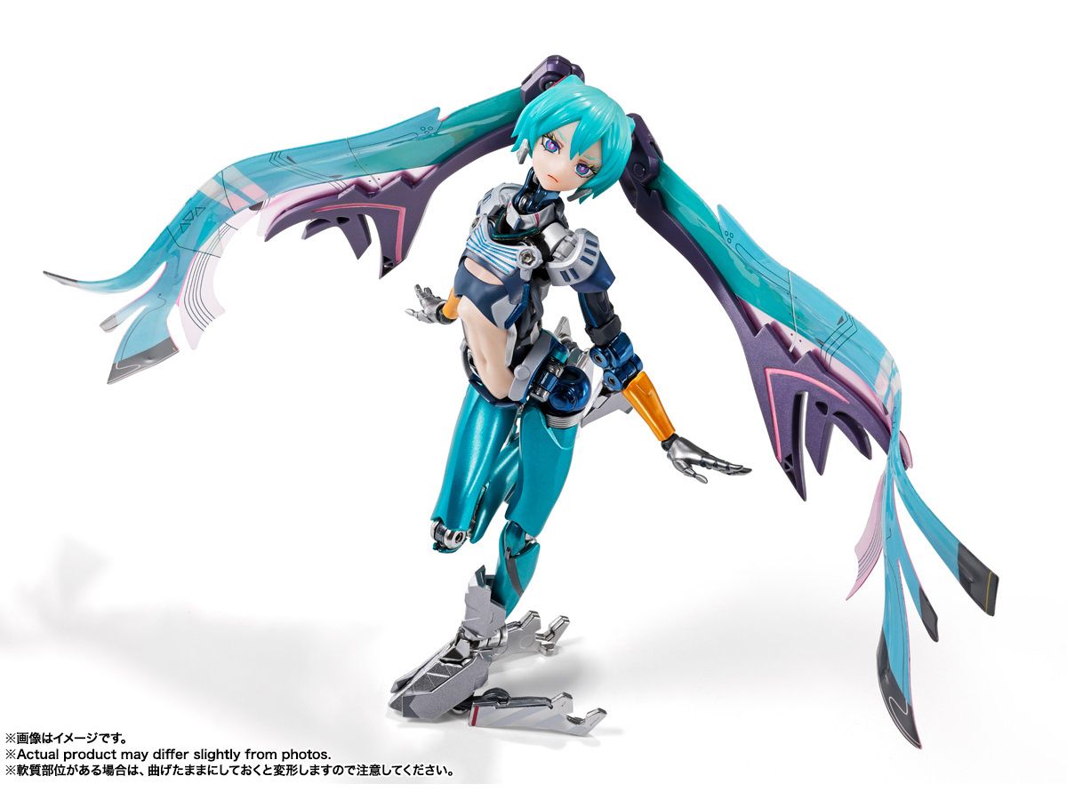 可動とデザインを両立したアレンジに布製衣装やワイヤー入りPVCシート製のツインテールといった複合素材を用いてMETAL BUILD化。