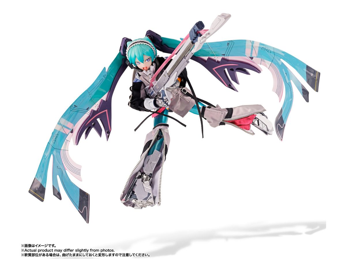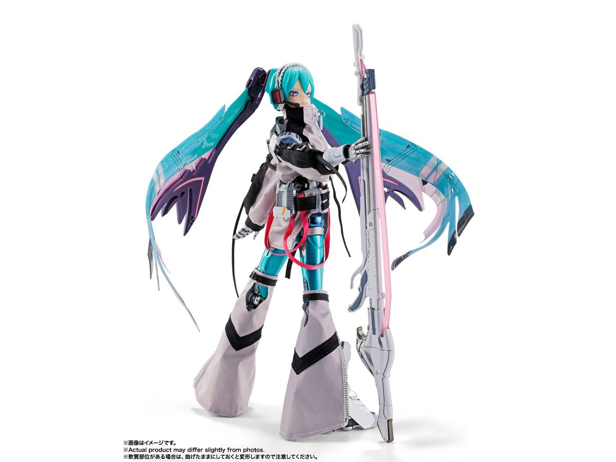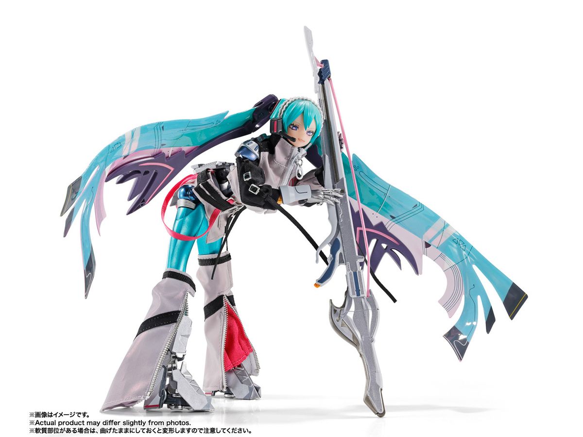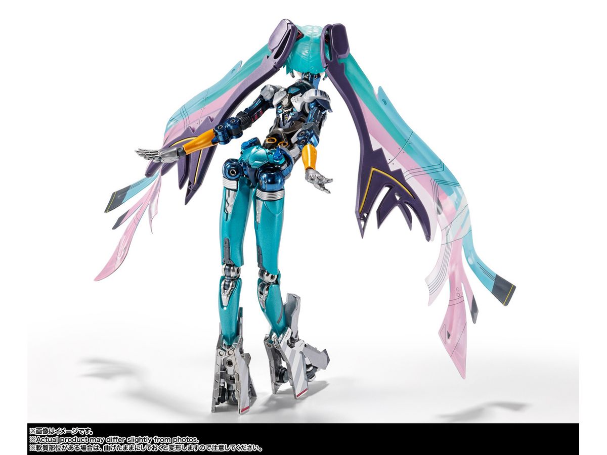 可動とデザインを両立したアレンジに布製衣装やワイヤー入りPVCシート製のツインテールといった複合素材を用いてMETAL BUILD化。