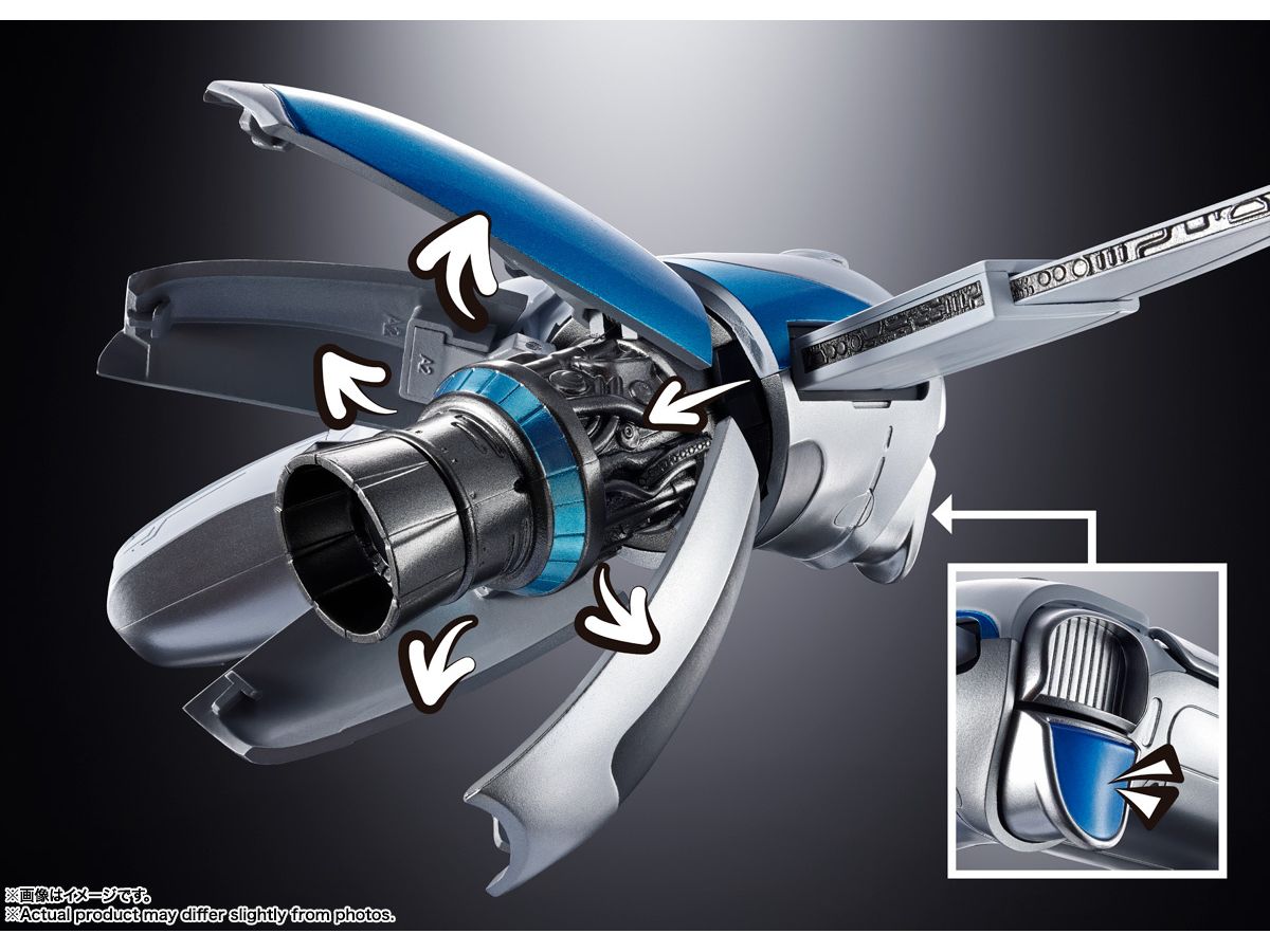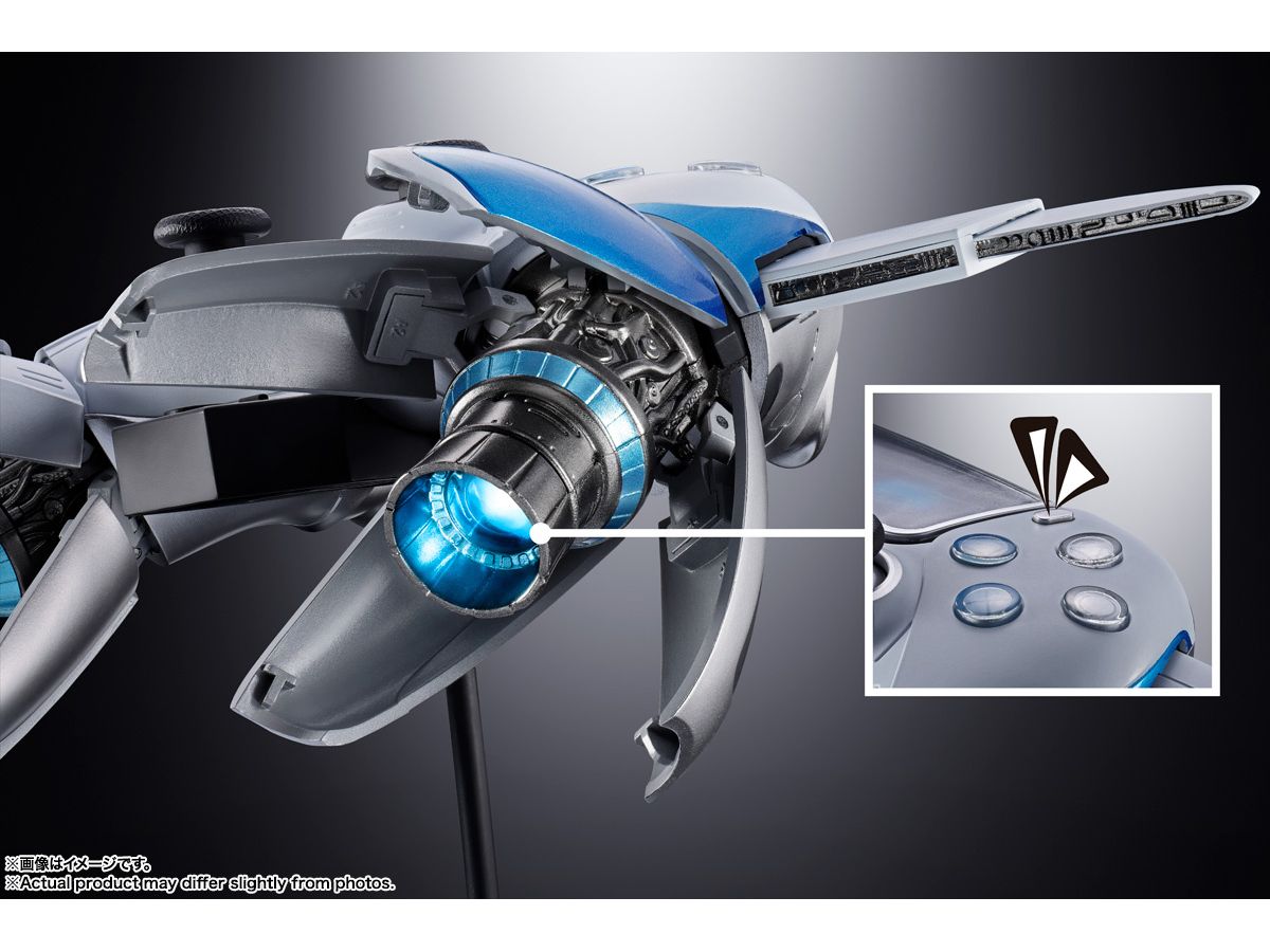 コントローラーからスペースシップへの変形は、各部のボタンを押すことで段階的に変形していく商品オリジナルのギミックで再現。