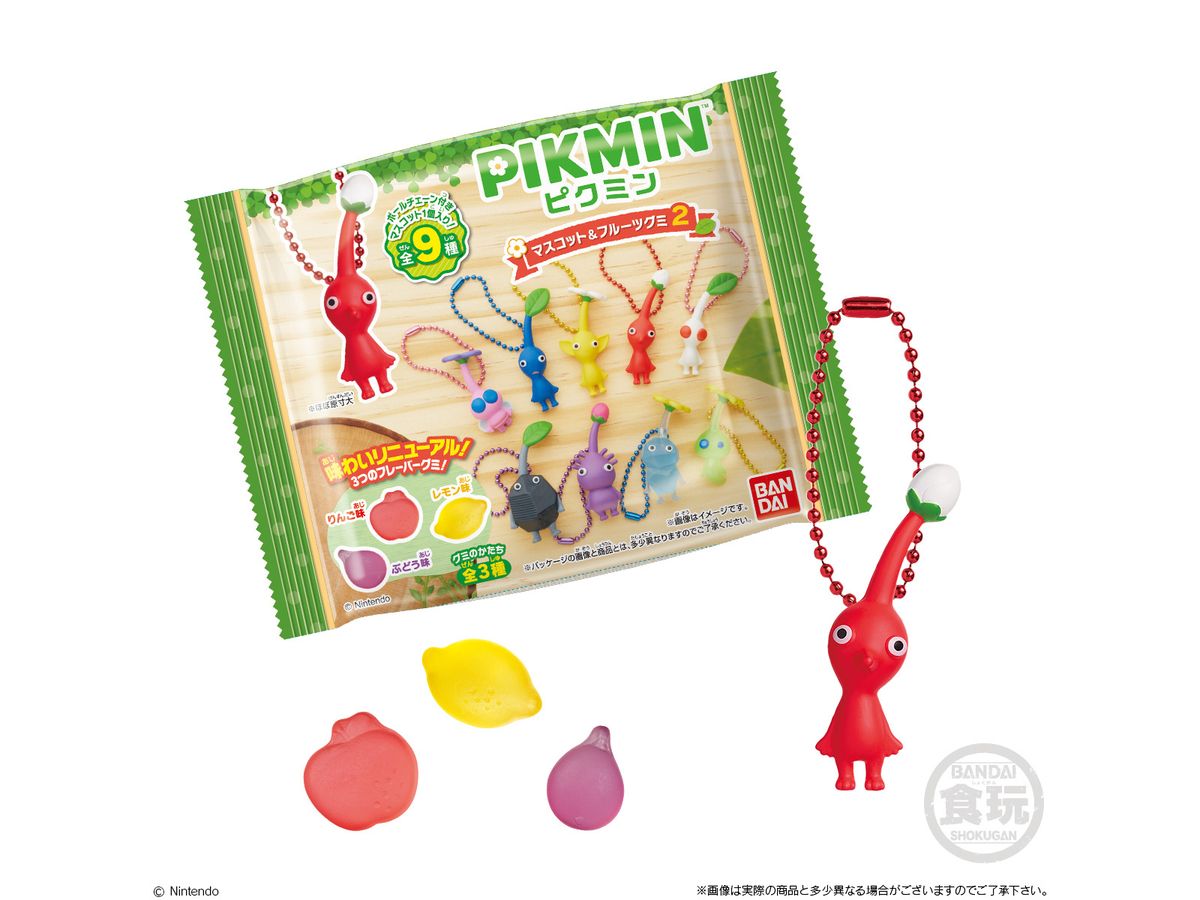 味わいをリニューアルしたグミと、ボールチェーン付きマスコットがセットになった ピクミンのマスコット付きグミです。