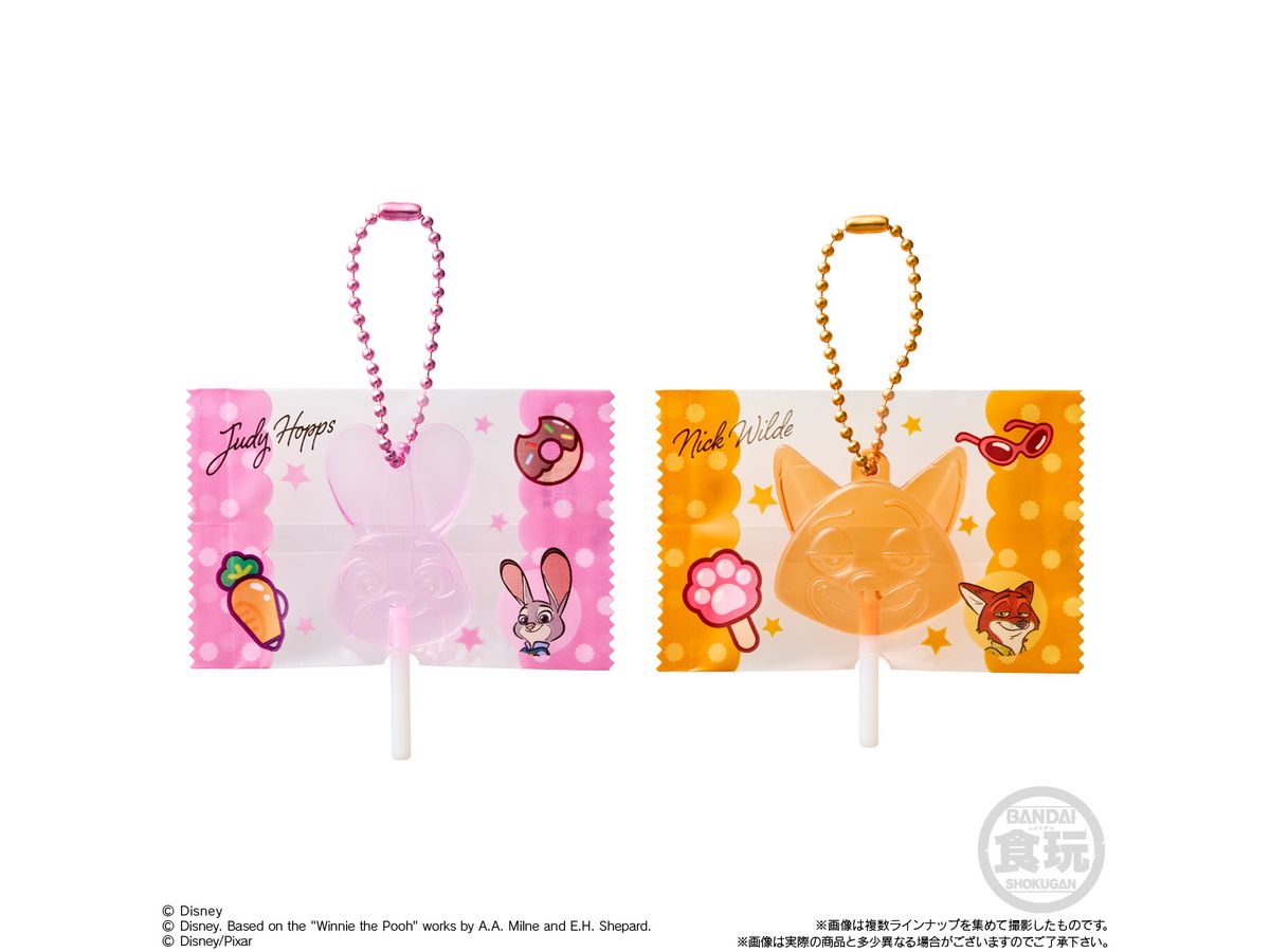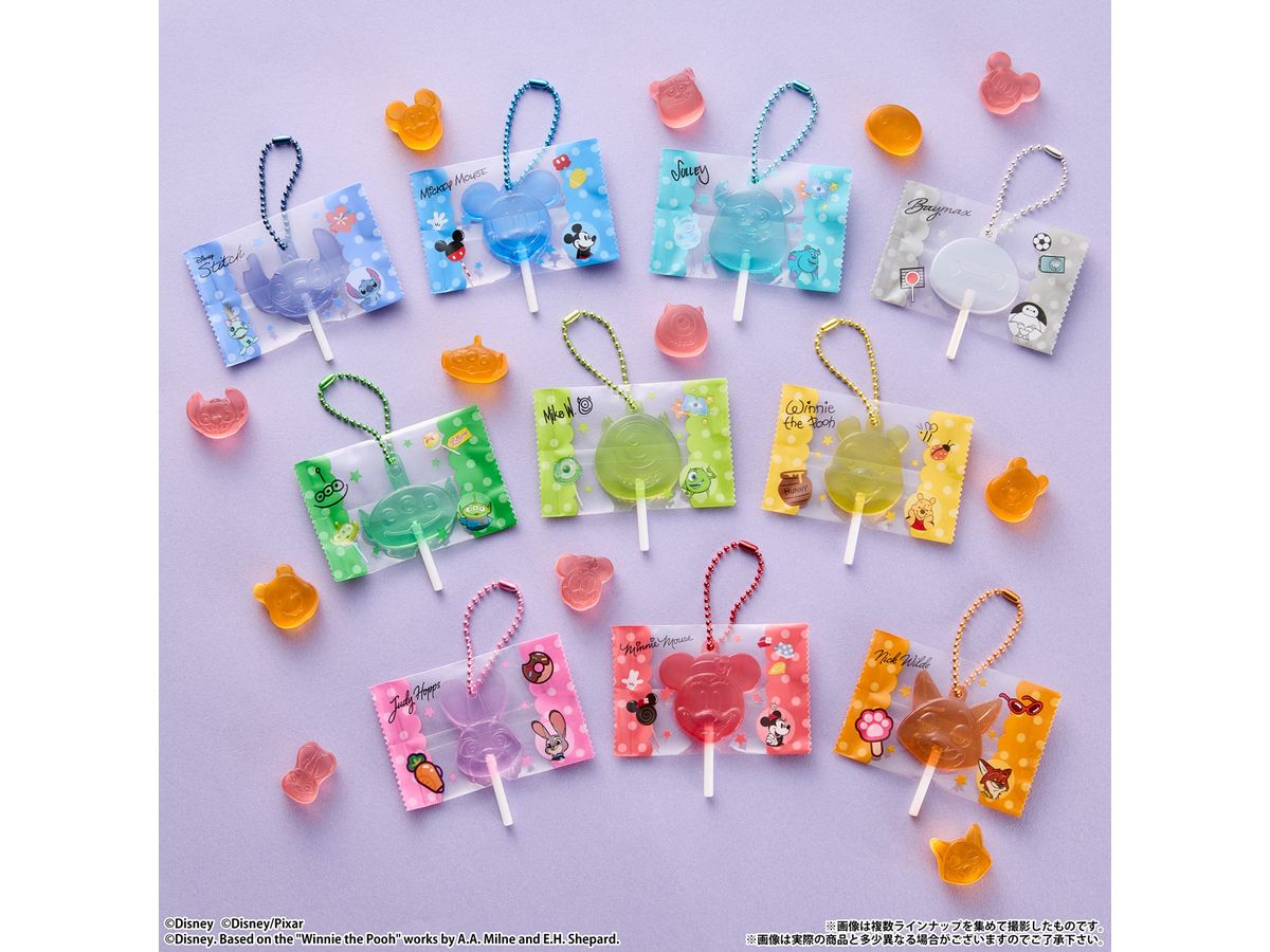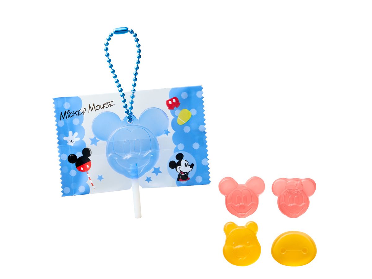 ディズニーキャラクターたちの形をしたトロピカルフルーツ味のグミに、ペロペロキャンディ風チャームが1個付きます。