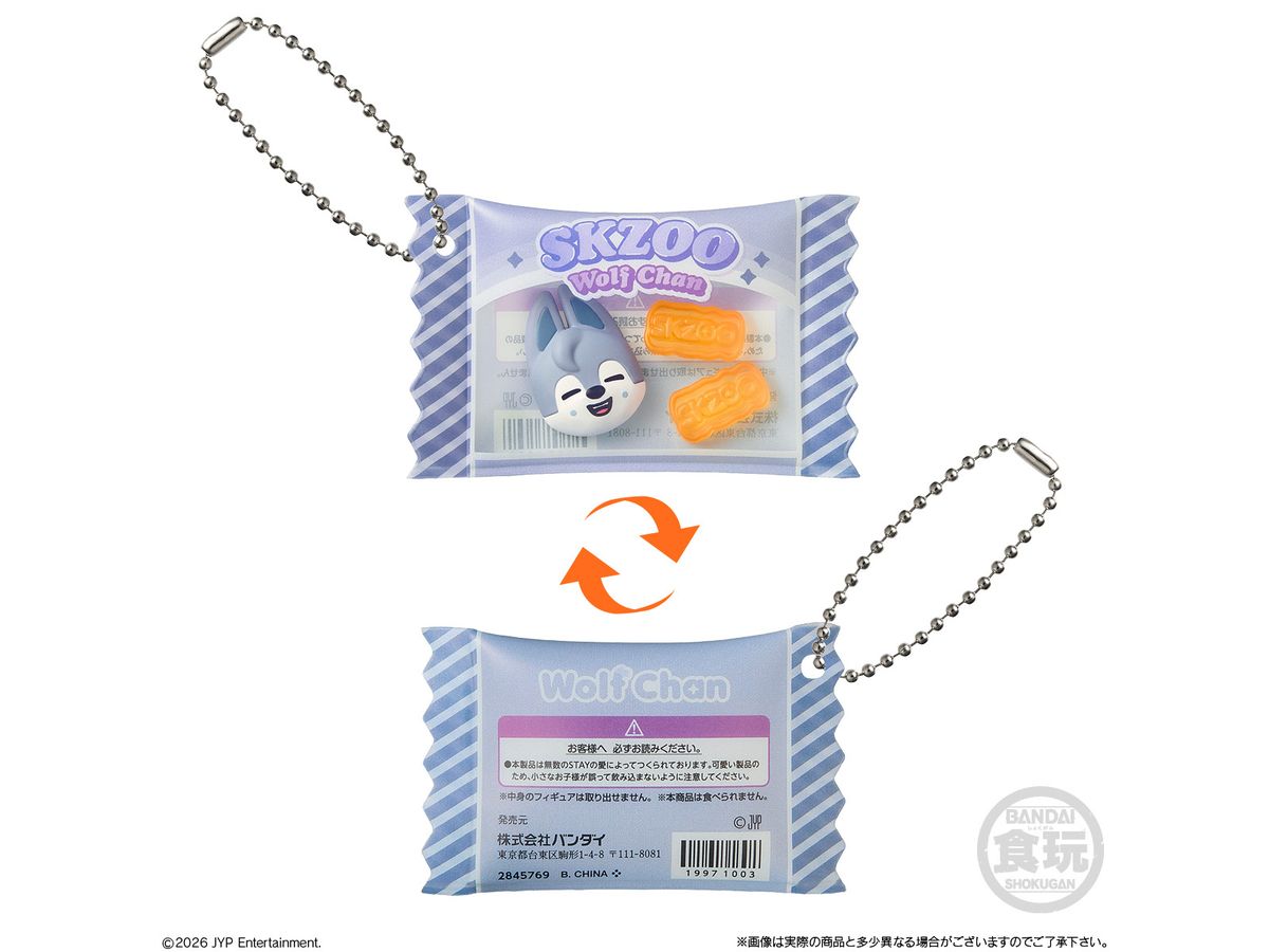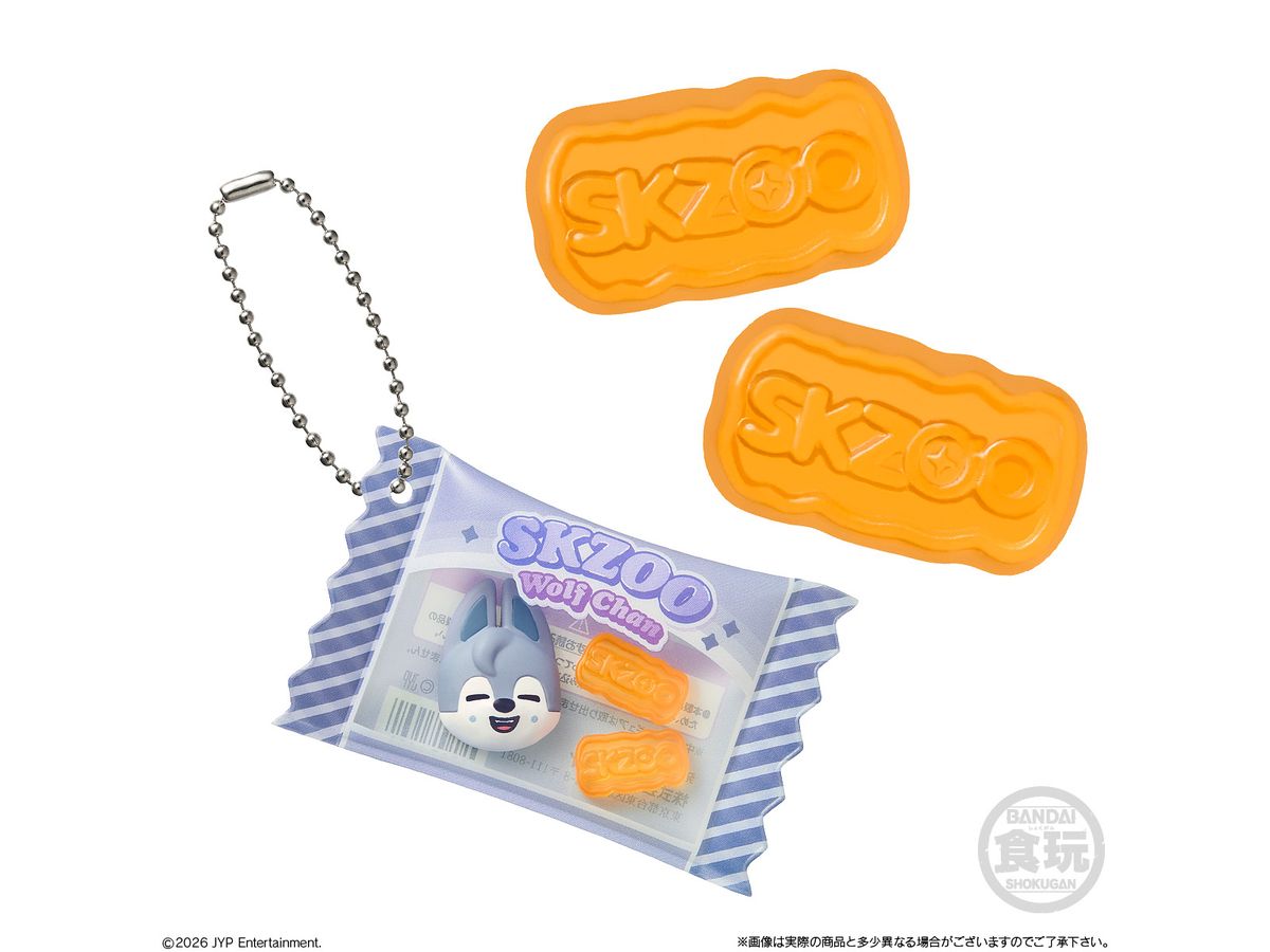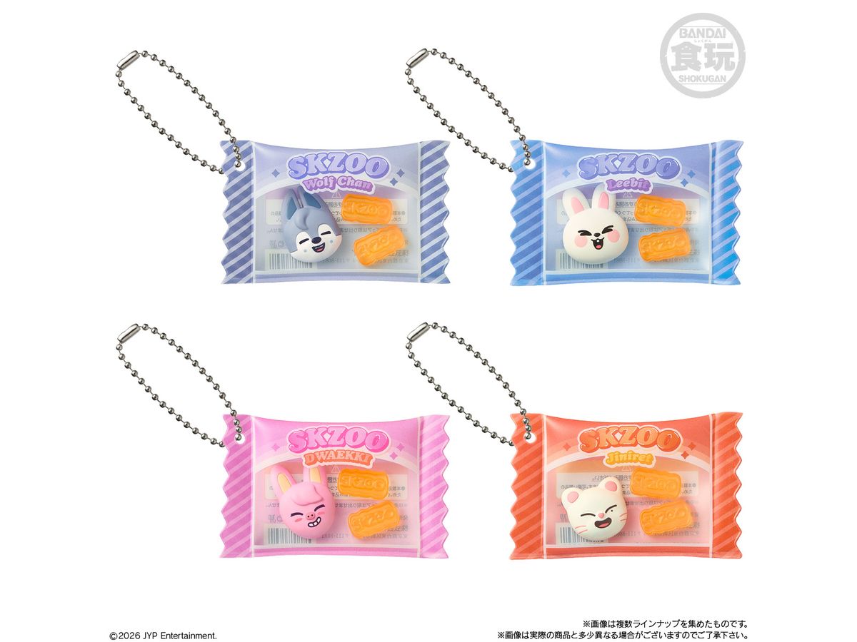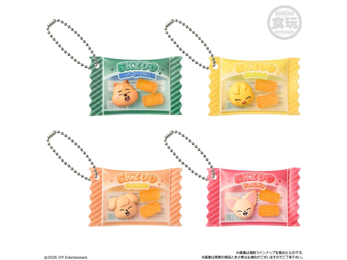 お菓子パッケージ風のチャームには『SKZOO』のマスコットとグミ型マスコットが入っていて、