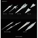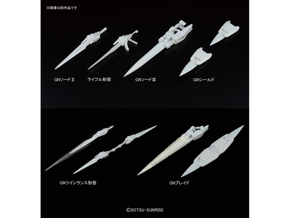 GNソードII、GNシールド、GNソードIII、GNビームサーベルが付属。ジョイントを介して、腰部や肩部等にマウントが可能。各武装を装備して、劇中の鉄劇アクションが再現可能。