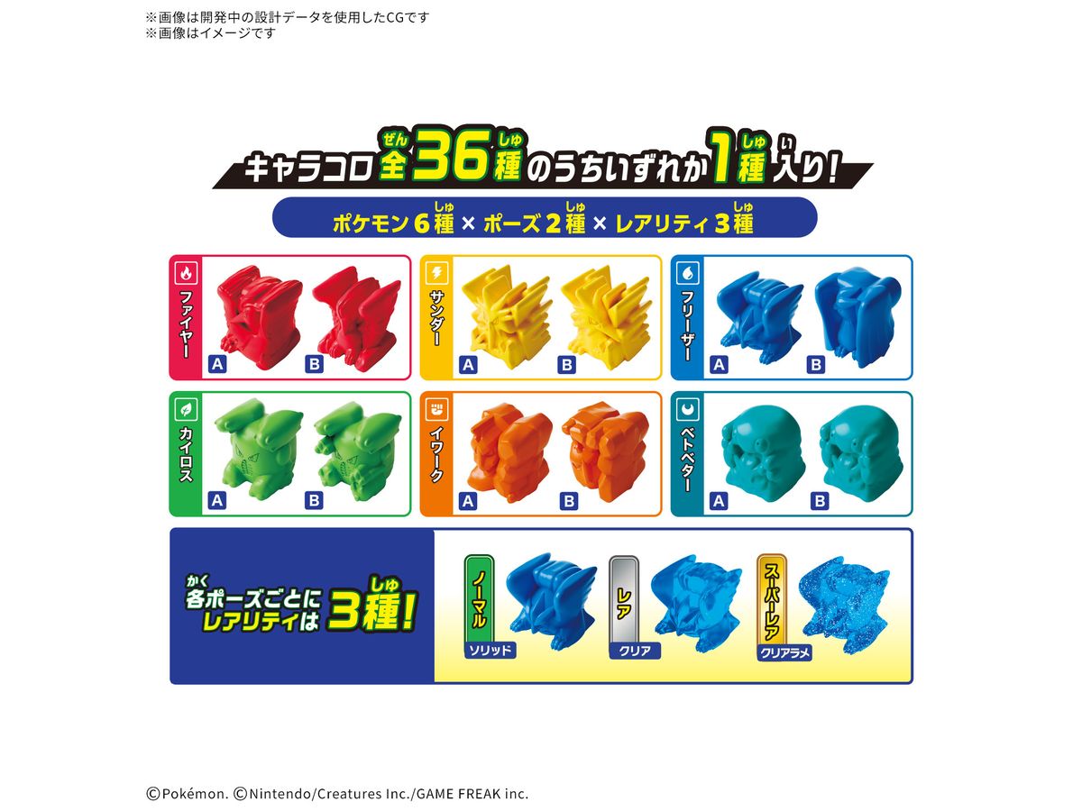 キャラコロ全36種(ポケモン6種×ポーズ2種×レアリティ3種)のうち、いずれか1種入り!