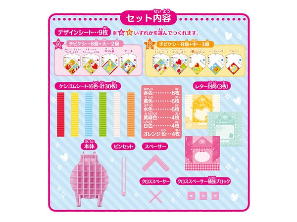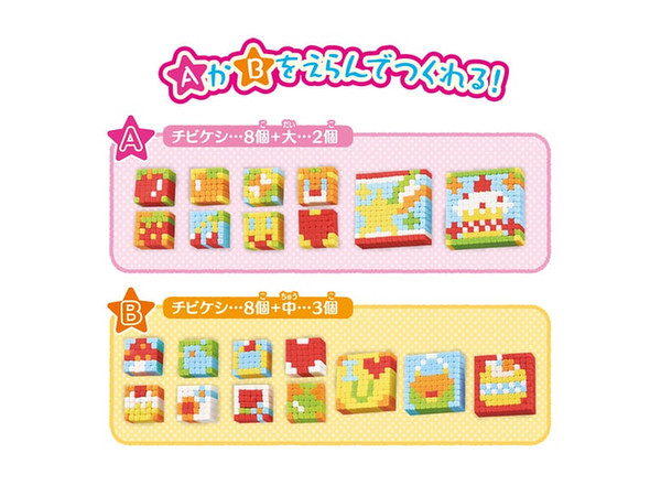 Aパターンはチビケシ8個+大消しゴム2個、Bパターンはチビケシ8個+中消しゴム3個、いずれか好きなデザインパターンを選んでセット内で作ることができます。