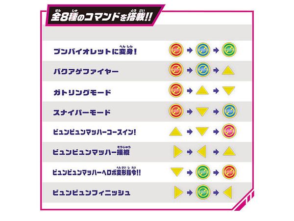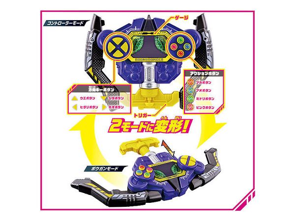 コントローラー・ボウガンの2モードに変形。全8種のコマンドを搭載、入力するコマンドに応じて変身・必殺技音声やゲージの発光を楽しむことができます。