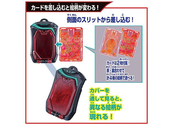 付属のライセンスカードを差し込むと異なる絵柄が現れる!カードは両面印刷で2枚付属!4種の絵柄で遊べます。