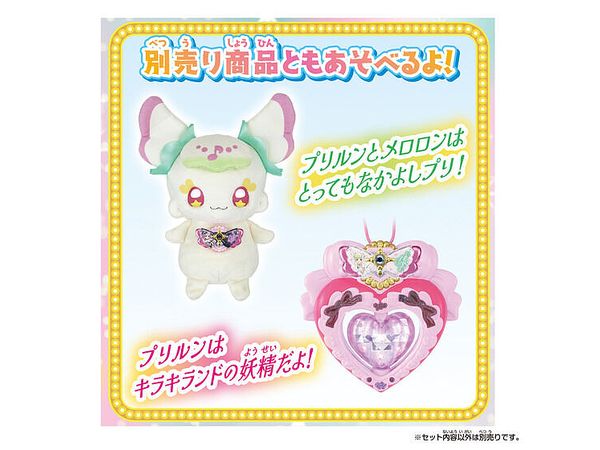 別売りの「キミとアイドル変身v(ハート)アイドルハートブローチ」や「くるくるまわして♪キラッキランリボンバトン」をはじめとした、さまざまなアイテムと連動します。