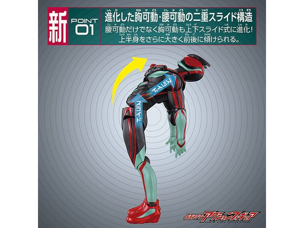 新搭載可動POINT01:上下スライド式の腰可動だけでなく、胸可動も上下スライド式に進化!更に上半身を前後に大きく傾けることが可能に。