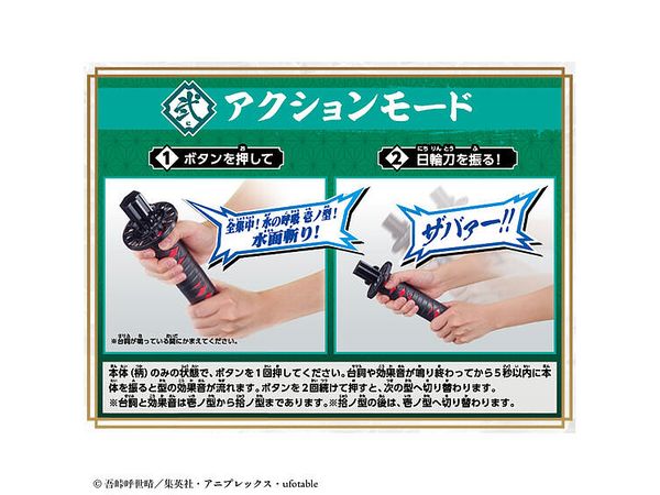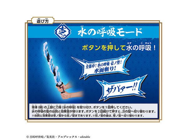 本体(柄)に刀身がついていると「水の呼吸モード」になり、ボタンを押して台詞と効果音を再生し、なりきり遊びが楽しめます。