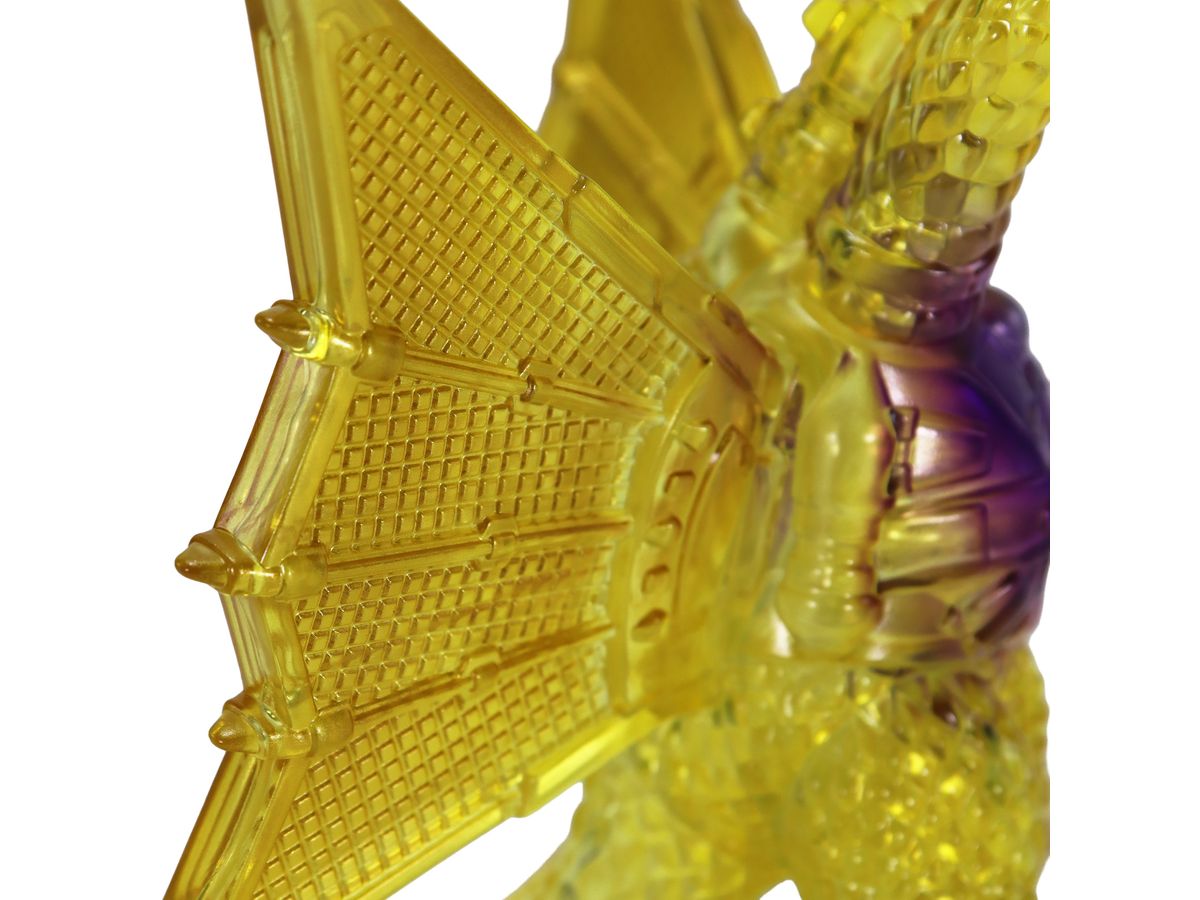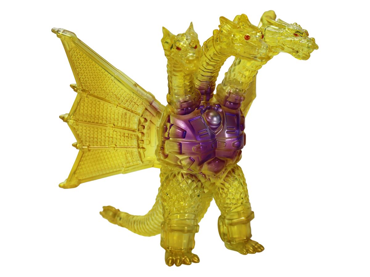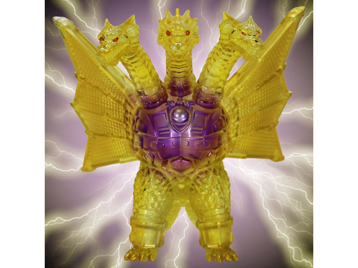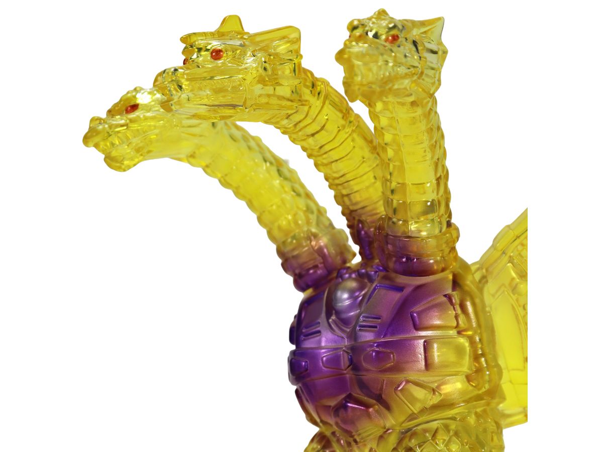 金色の輝きの中から姿を現すメカキングギドラを、クリアソフビにクリアイエロー・ゴールド、中央にはパープルのグラデーションを彩色して鮮やかに表現しています。