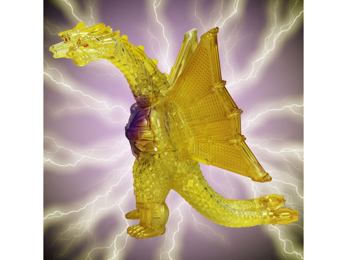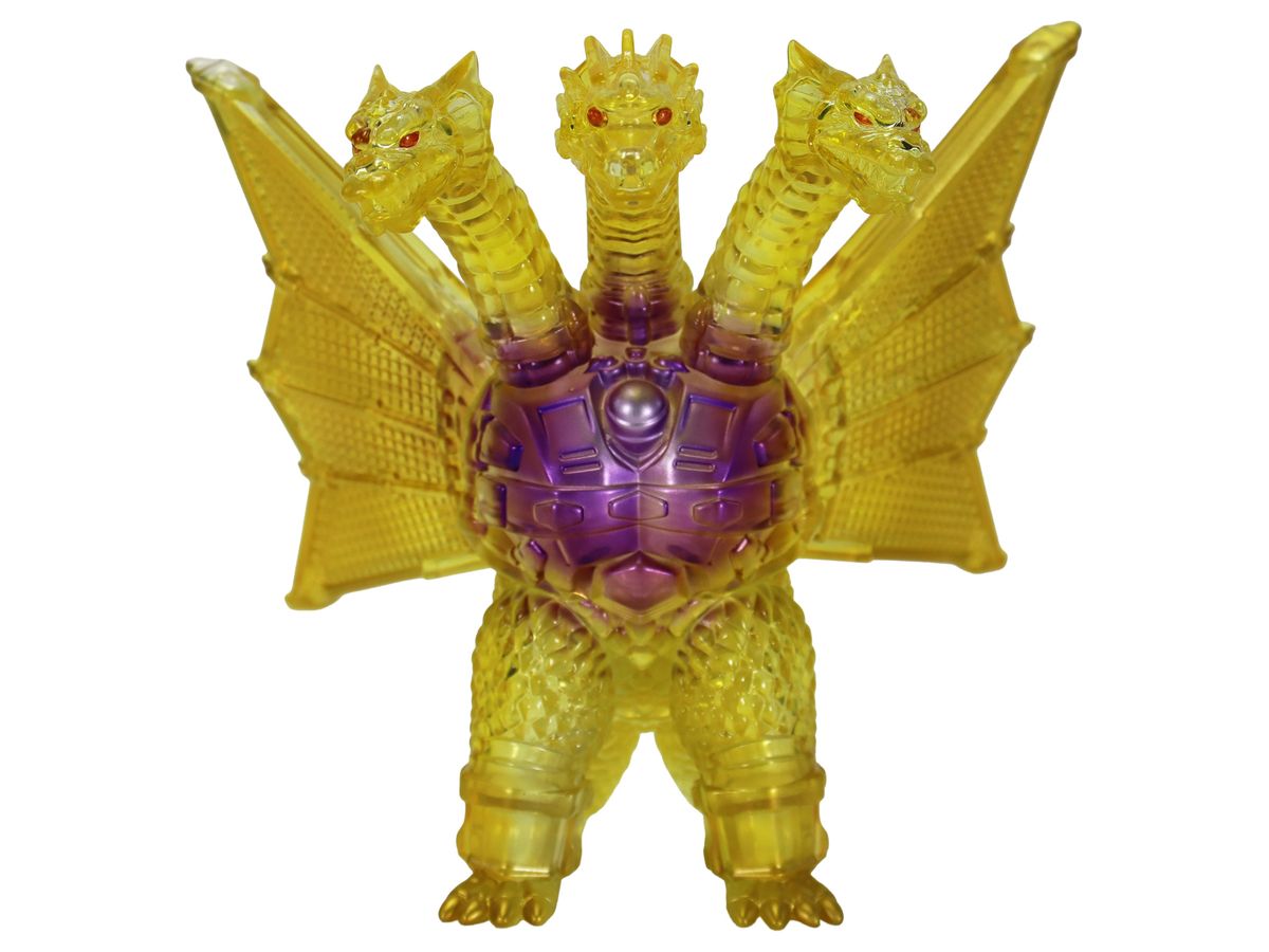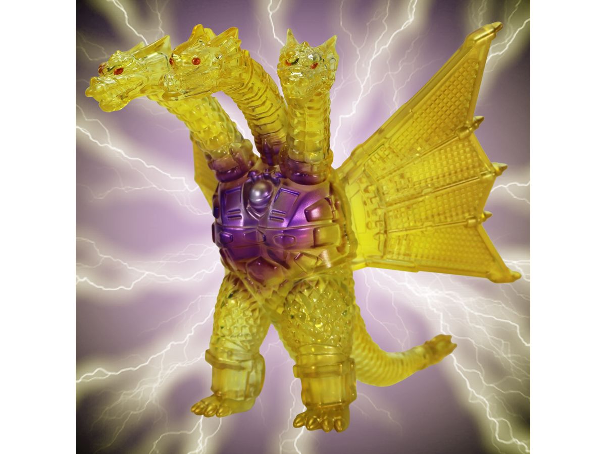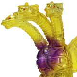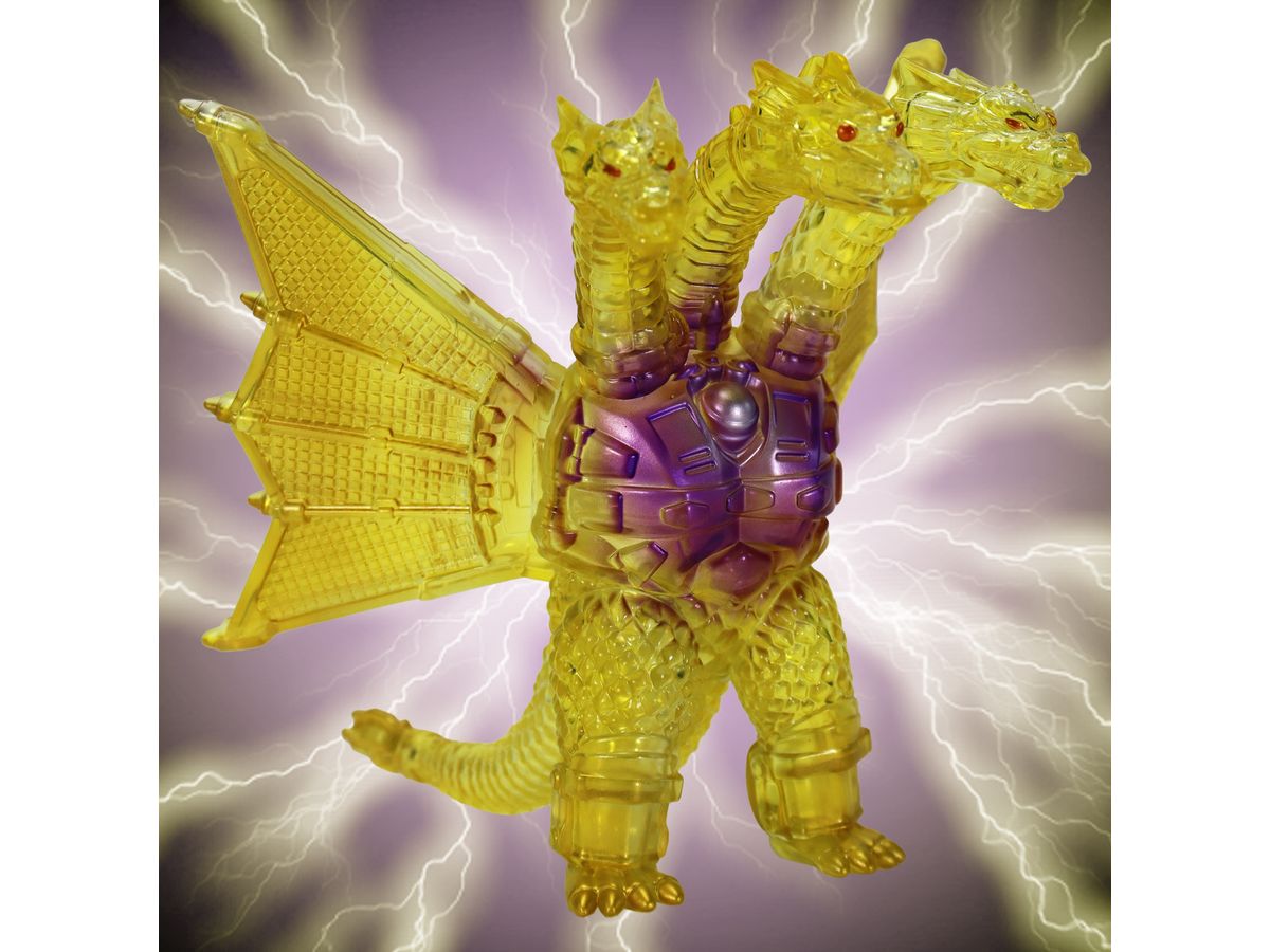 金色の輝きの中から姿を現すメカキングギドラを、クリアソフビにクリアイエロー・ゴールド、中央にはパープルのグラデーションを彩色して鮮やかに表現しています。