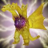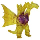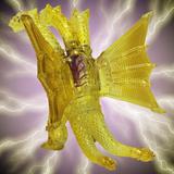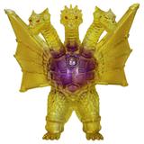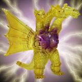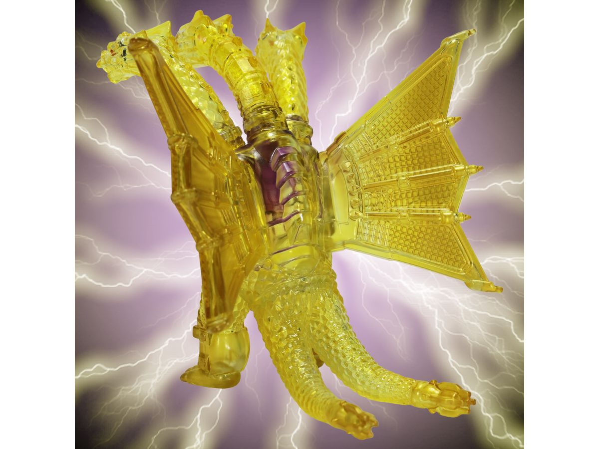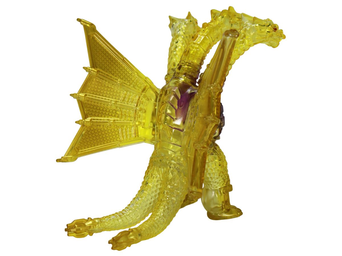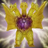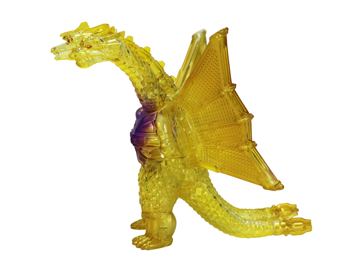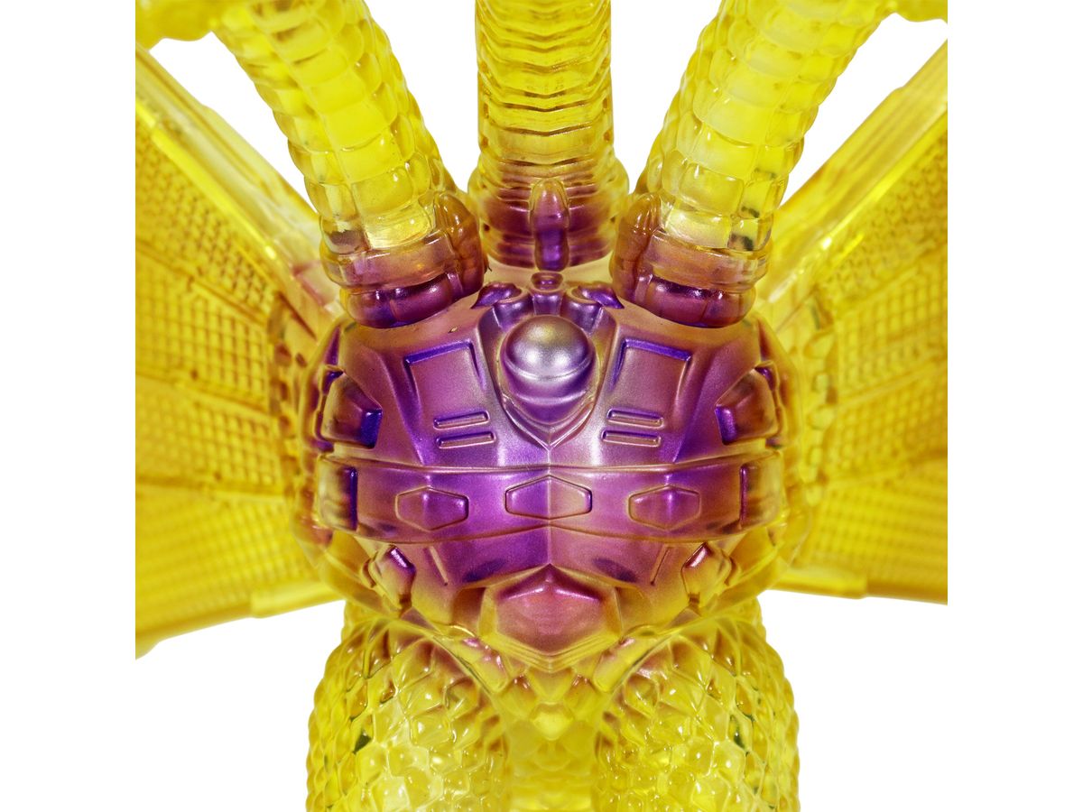 金色の輝きの中から姿を現すメカキングギドラを、クリアソフビにクリアイエロー・ゴールド、中央にはパープルのグラデーションを彩色して鮮やかに表現しています。