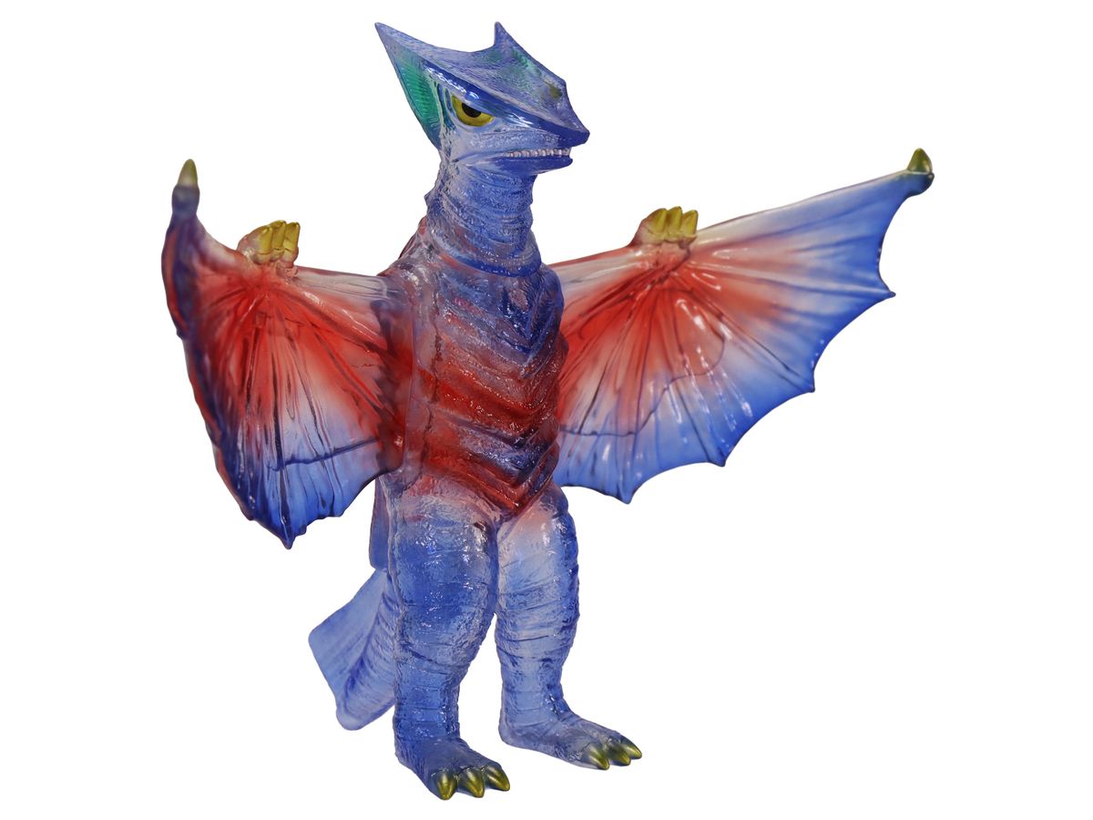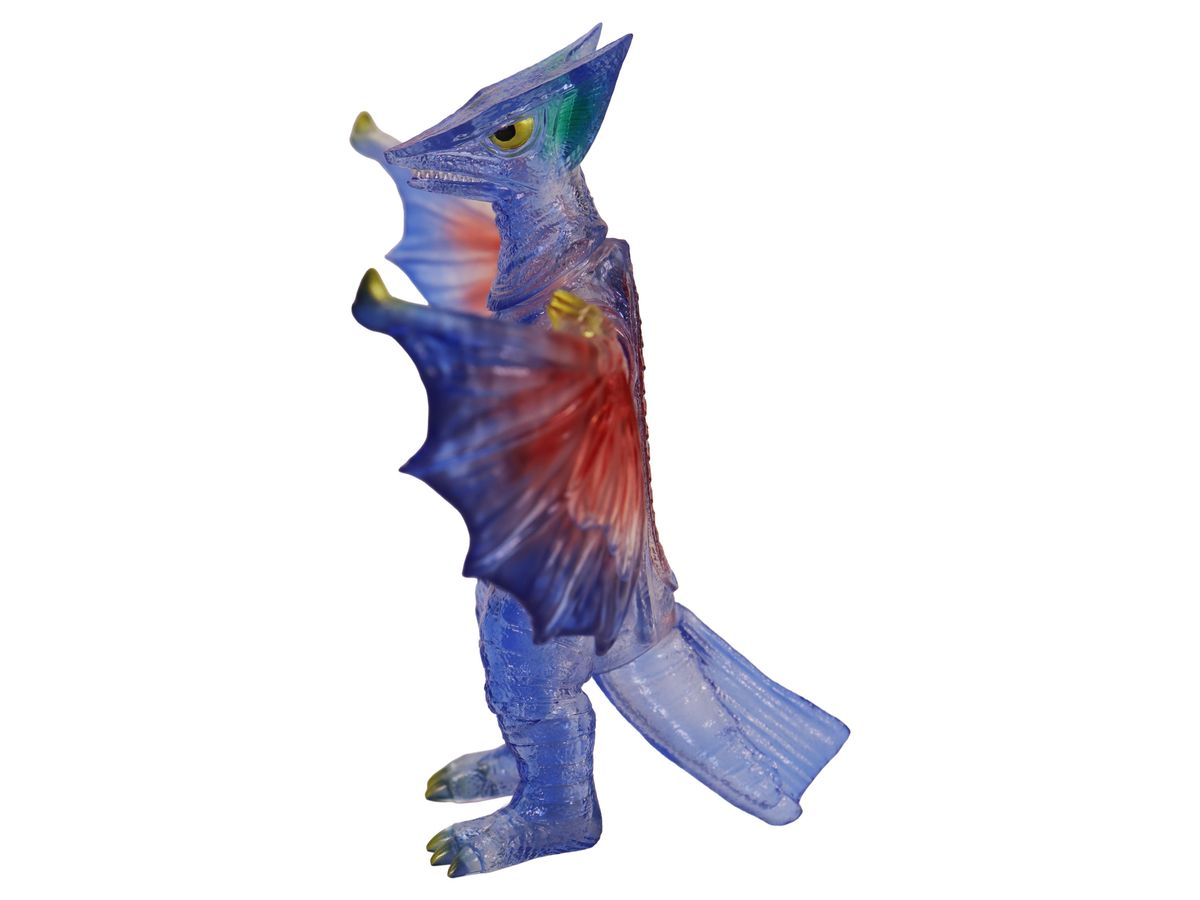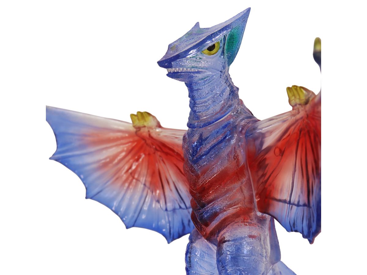 三角状の頭部や体表の特徴を捉えたディテール、前にしなるようなポージングを加えた翼など見ごたえのある造型に、「レトロブルークリアVer.」では日本国内成型による透明度の高いクリア成型に、クリアブルー・クリアレッドの彩色や、発光する耳のグリーンなどを彩色した豪華な仕様となっています。