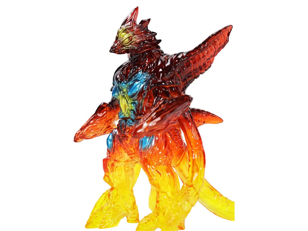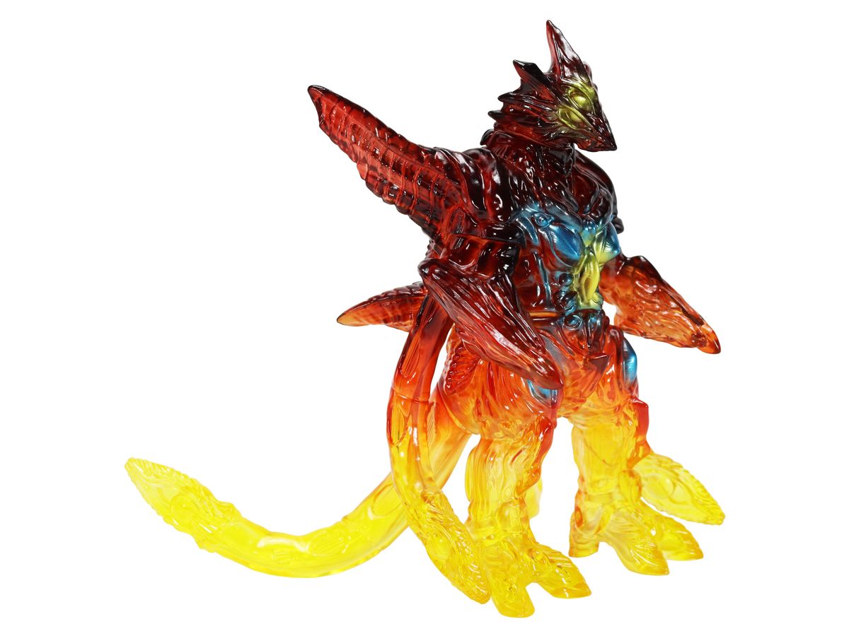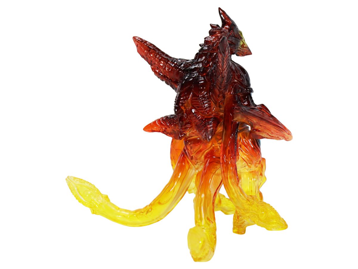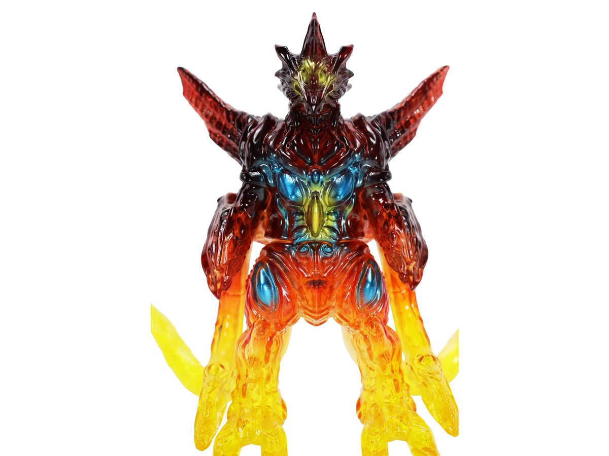 ミドルサイズシリーズより、劇中の名場面をイメージした美しいガメラ達が登場!!「イリス 京都炎上 Ver.」では、燃える京都でガメラ対峙するイリスを、クリアソフビ成形・彩色を駆使して美しく表現。燃え上がる炎を、足元からクリアイエロー・クリアレッドのグラデーションを彩色施す事で、熱源まで感じられるかのような仕上がりとなっています。発光器官から光が漏れるイメージで彩色された目玉や胸部の美しさもポイントです。CCPJAPANによるこだわりが詰まった美しいソフビをどうぞお楽しみください。