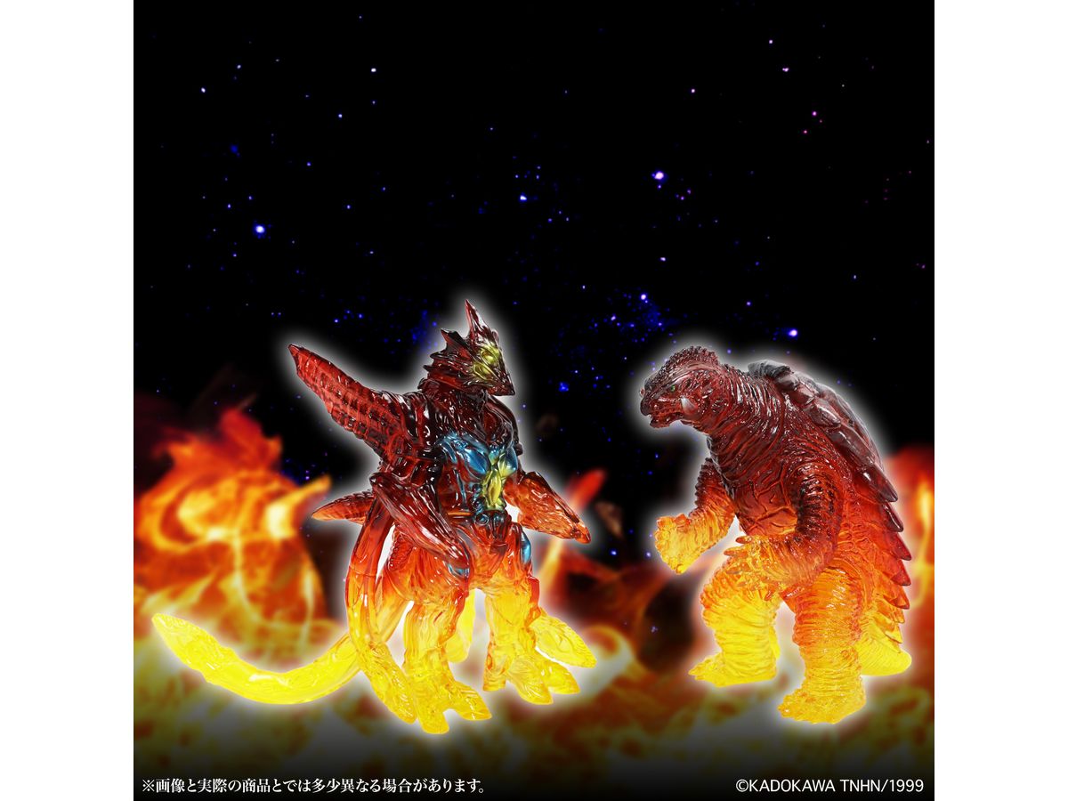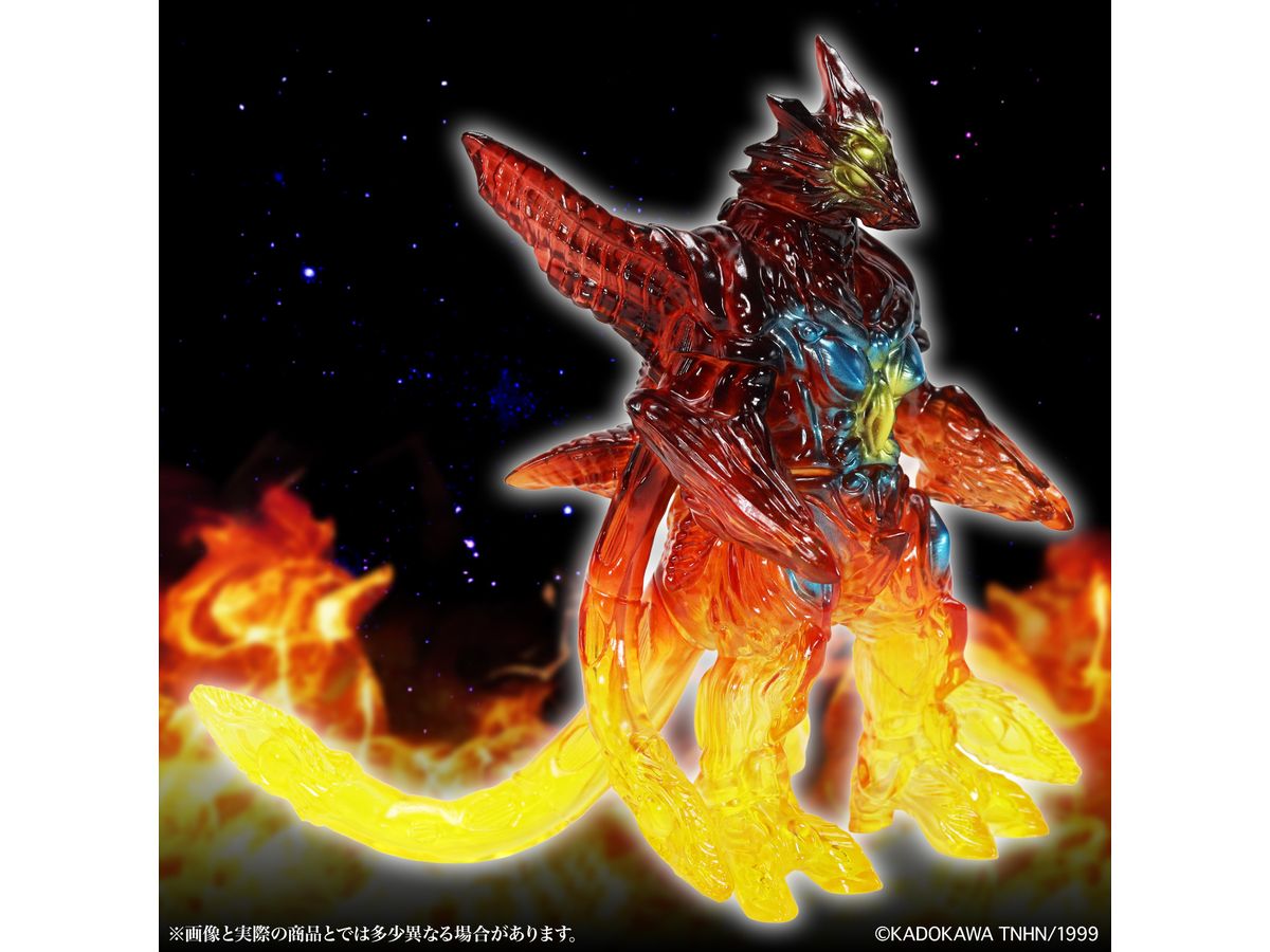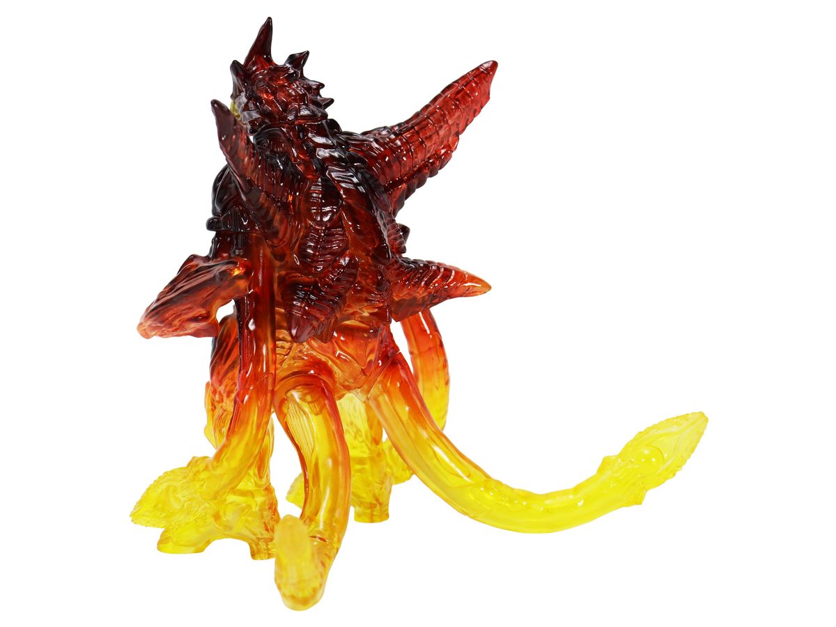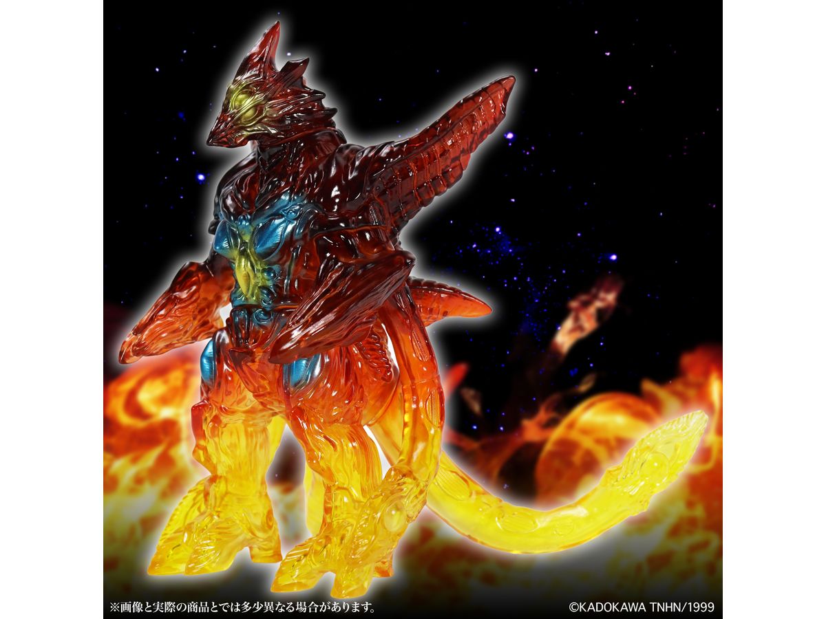 ミドルサイズシリーズより、劇中の名場面をイメージした美しいガメラ達が登場!!「イリス 京都炎上 Ver.」では、燃える京都でガメラ対峙するイリスを、クリアソフビ成形・彩色を駆使して美しく表現。燃え上がる炎を、足元からクリアイエロー・クリアレッドのグラデーションを彩色施す事で、熱源まで感じられるかのような仕上がりとなっています。発光器官から光が漏れるイメージで彩色された目玉や胸部の美しさもポイントです。CCPJAPANによるこだわりが詰まった美しいソフビをどうぞお楽しみください。
