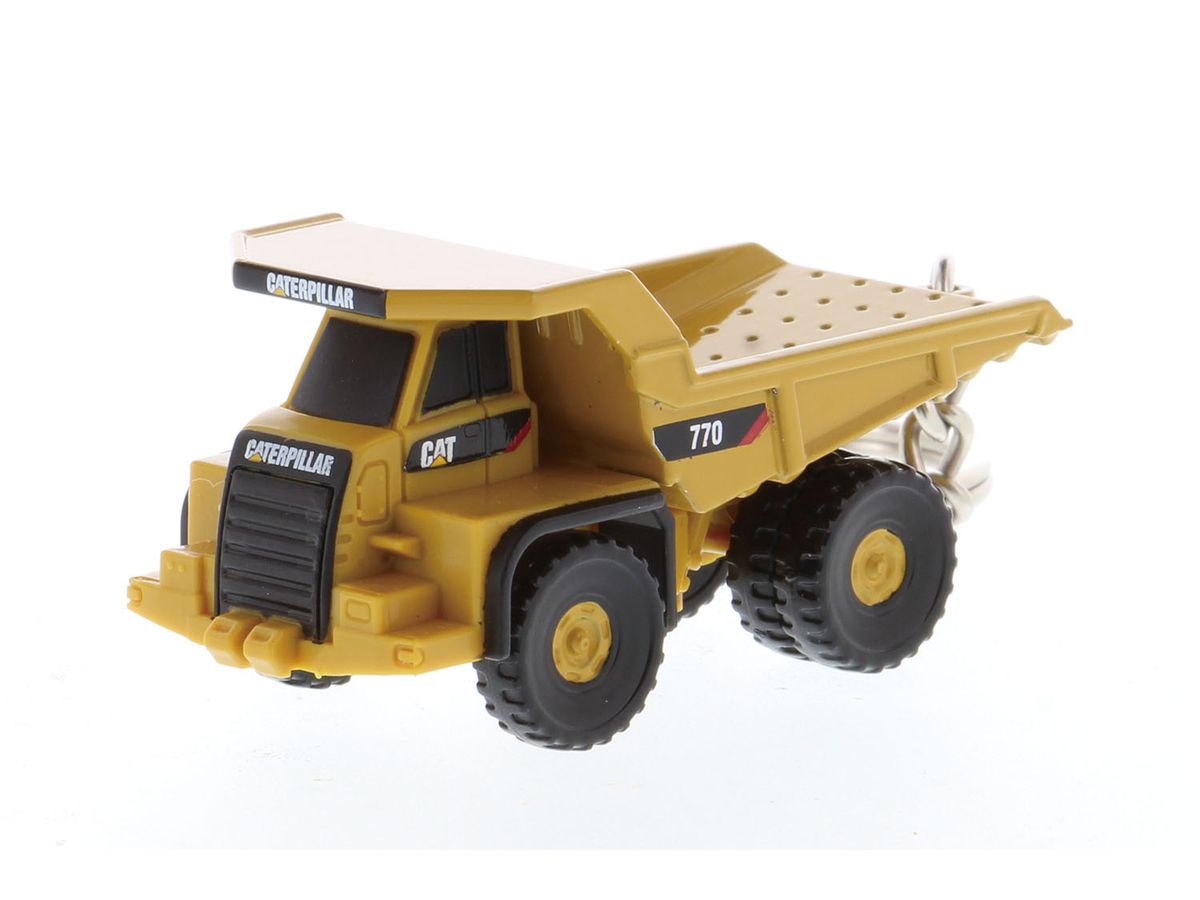 世界的な建設機械メーカー、キャタピラー社のCAT 770 オフハイウェイトラックを再現したミニモデルが付いたキーホルダーです。