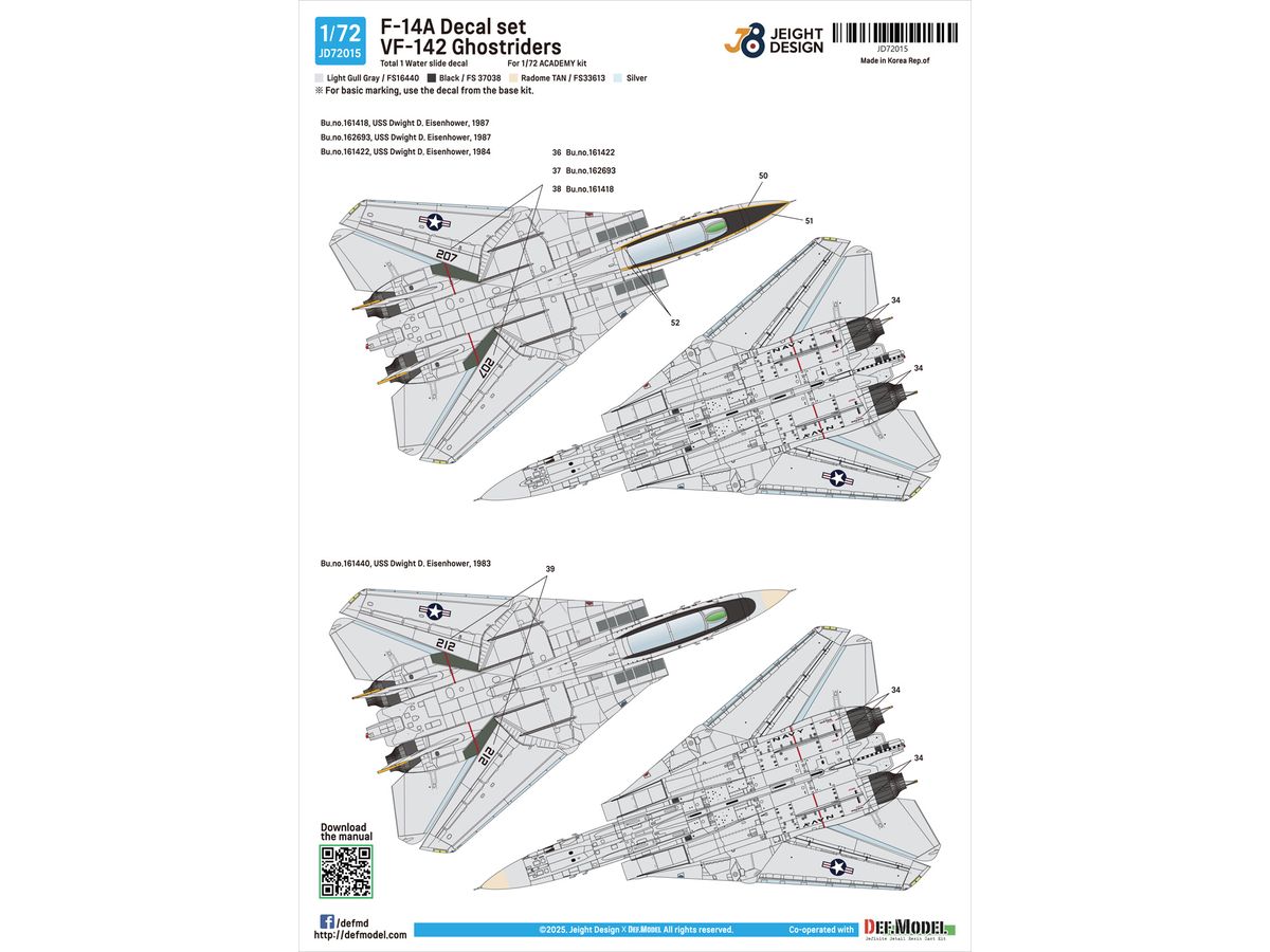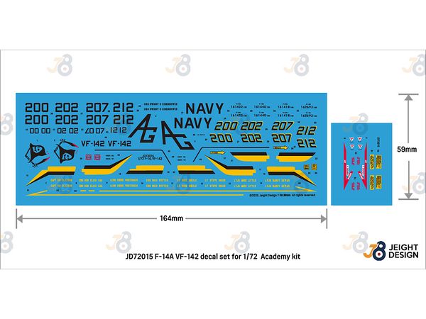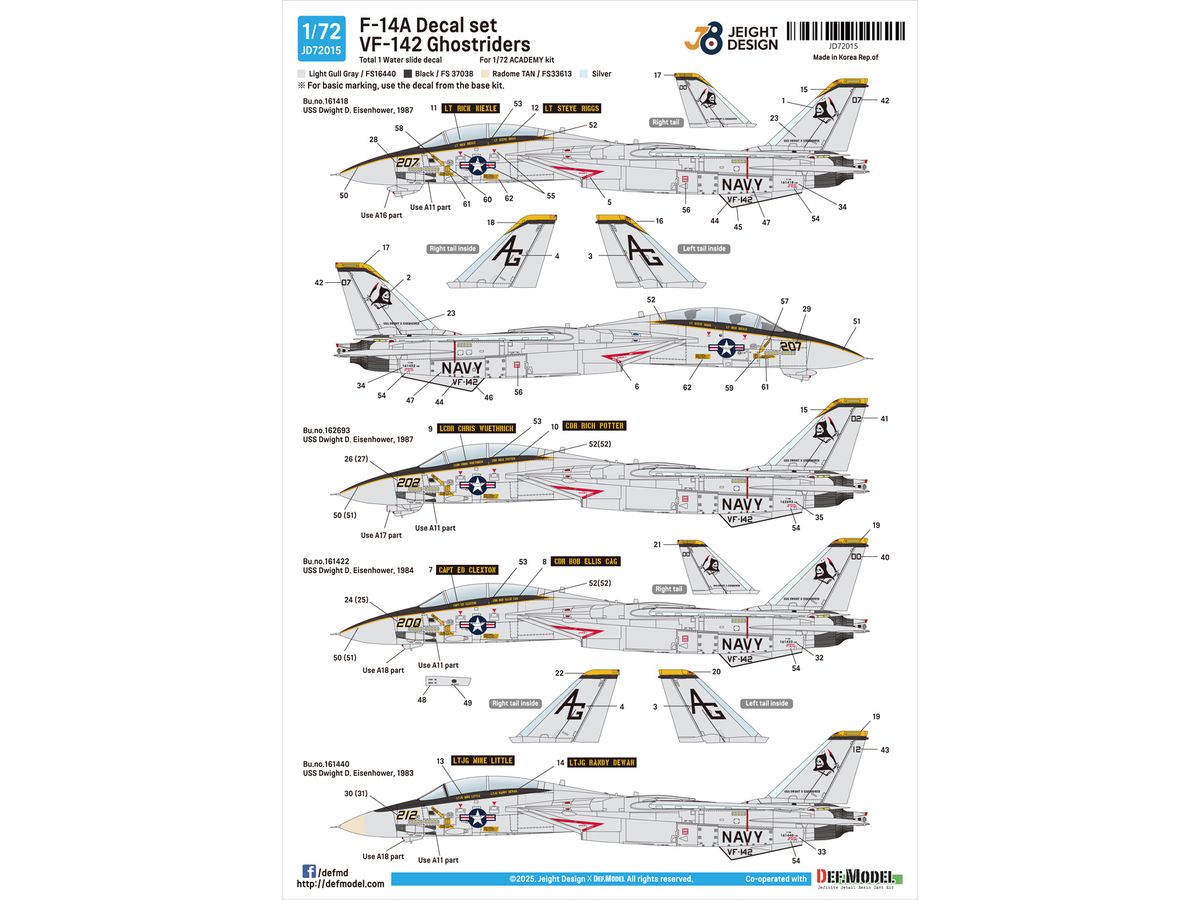1983年から1987年に空母「ドワイト・D・アイゼンハワー」に搭載されたVF-142ゴーストライダーズ所属のF-14Aトムキャットのマーキングを収録したデカールセットです。