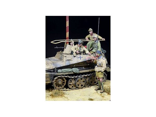 第二次大戦の北アフリカ戦線で「砂漠のキツネ」として連合国から恐れられたドイツ・アフリカ軍団の指揮官エルヴィン・ロンメル将軍と、彼が愛用した指揮車両Sd.Kfz.250/3「グライフ」の乗員3名、および彼と会話する戦車兵将校のレジン製5体入フィギュアセットです。