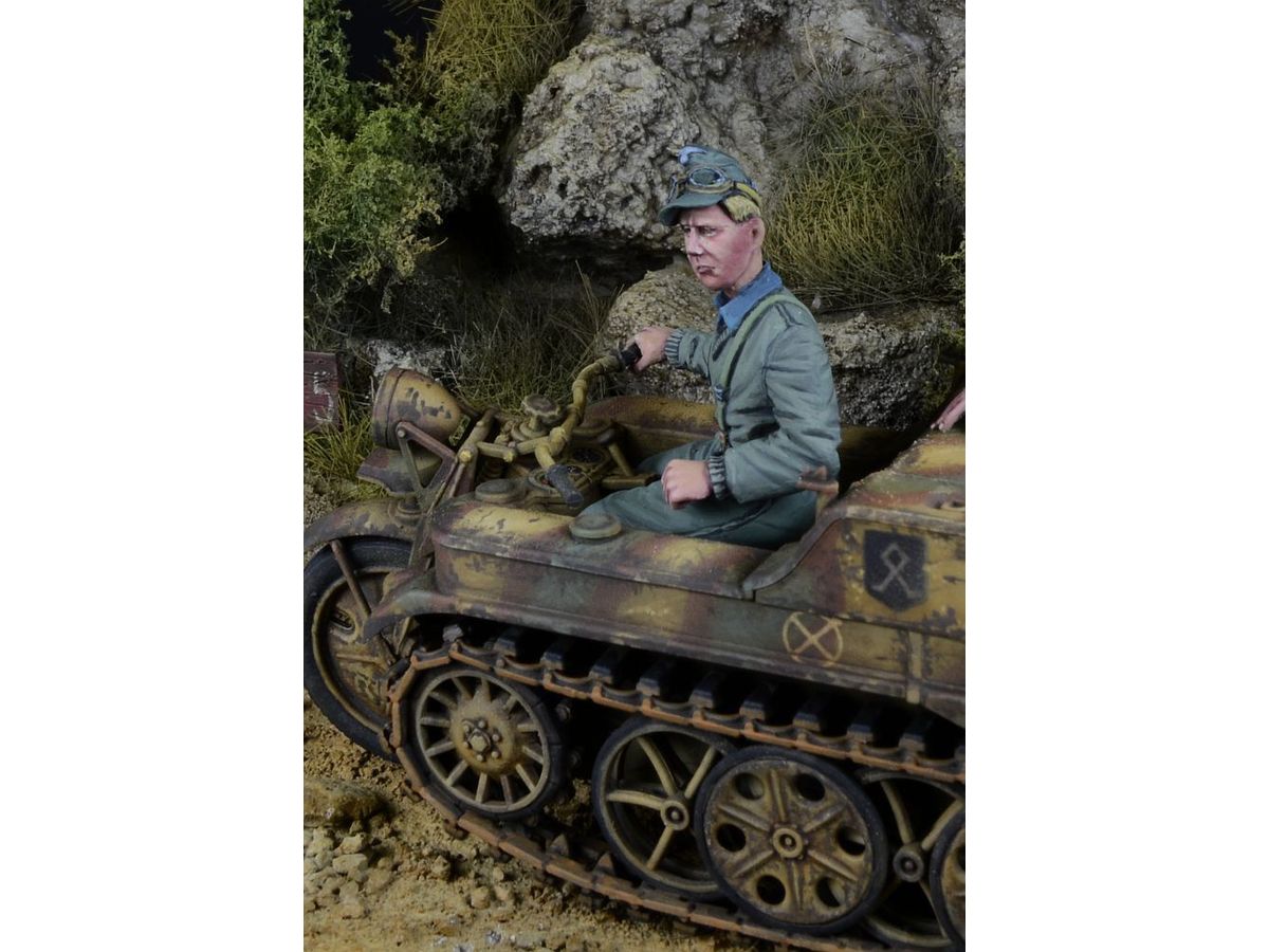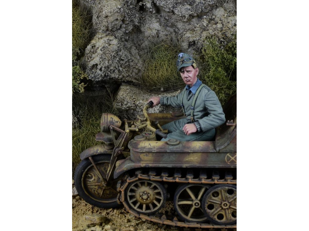 第二次大戦ドイツの武装親衛隊師団の第7SS義勇山岳師団「プリンツ・オイゲン」所属のケッテンクラート操縦手を再現したレジン製フィギュアです。タミヤ製キットに対応します。