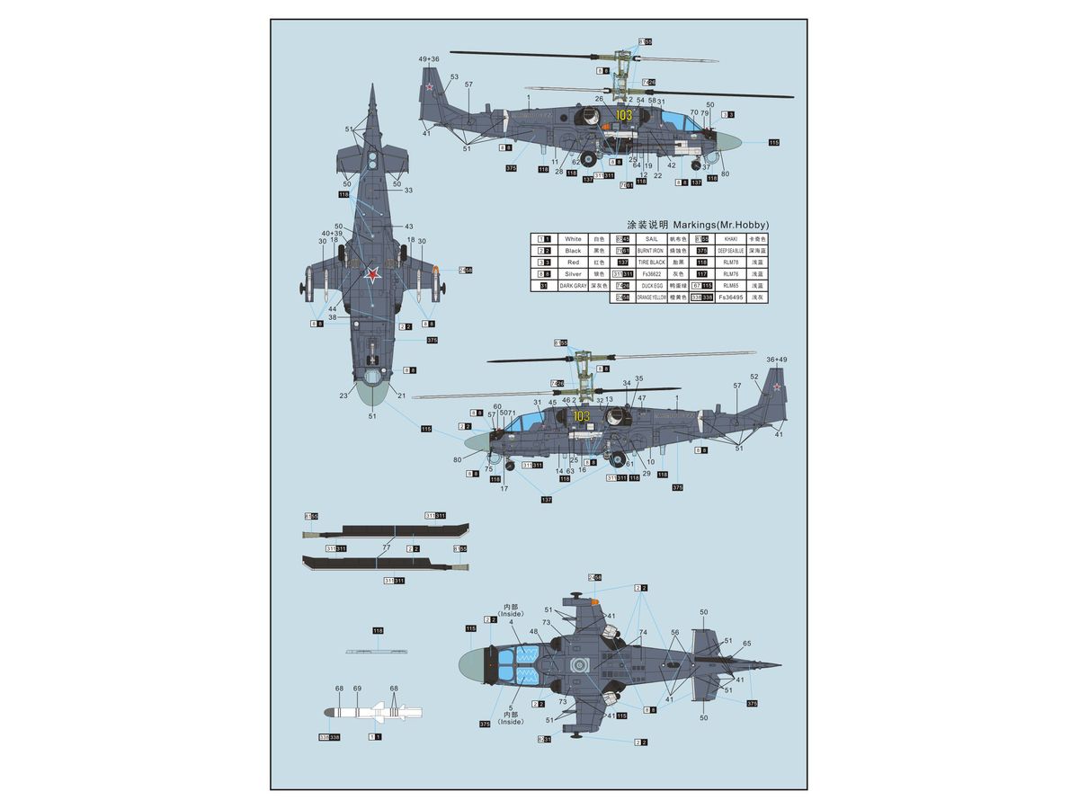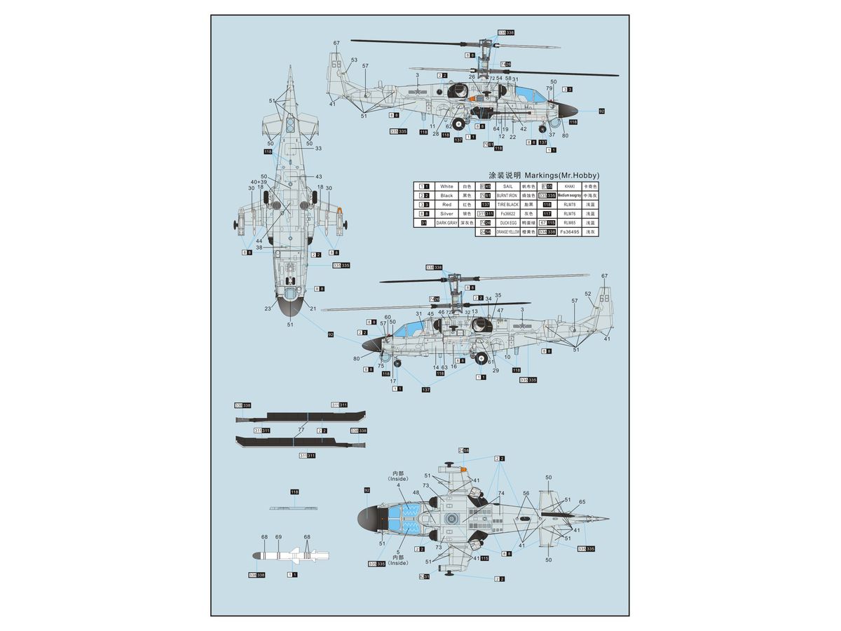 このキットは新規金型インジェクション製パーツによりKa-52Kを再現しています。ローターは広げた状態と畳んだ状態の選択が可能で、エッチングパーツと2種デカールが付属しています:ロシア海軍と中国海軍 x 各1。
