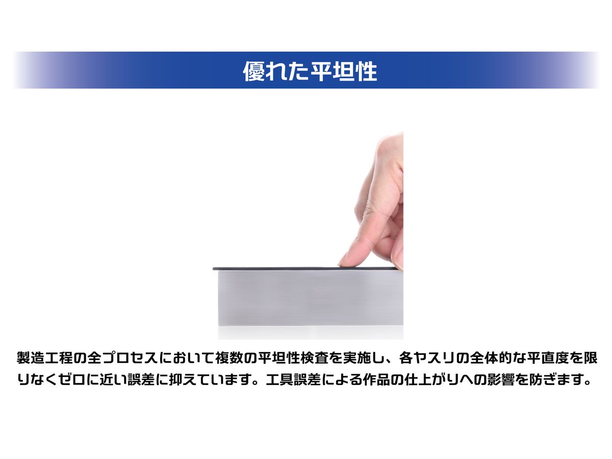 製造工程の全プロセスにおいて複数の平坦性検査を実施し、各ヤスリの全体的な平直度を限りなくゼロに近い誤差に抑えています。