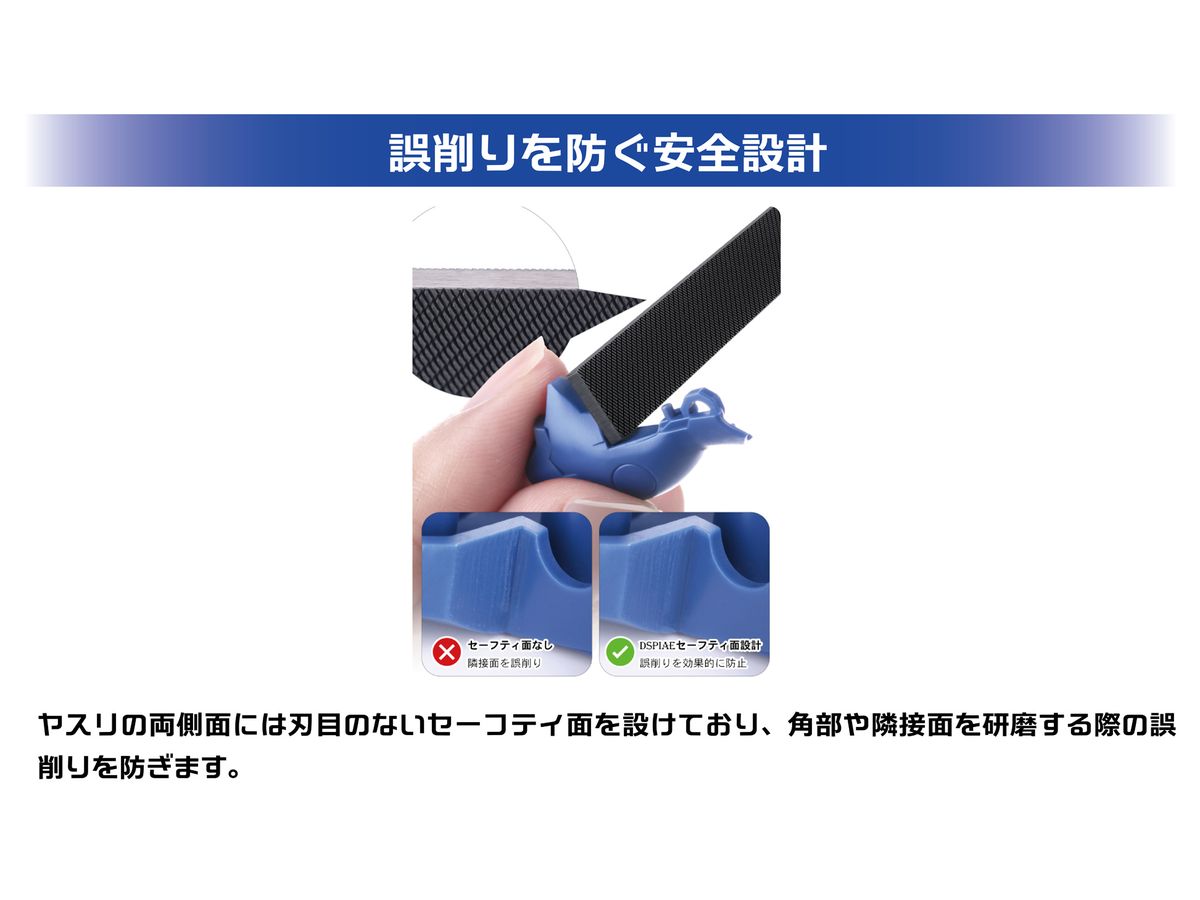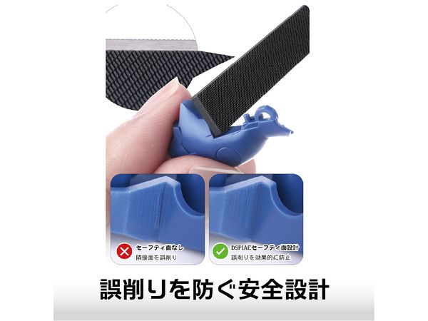 ヤスリの両側面には刃目のないセーフティ面を設けており、角部や隣接面を研磨する際の誤削りを防ぎます。