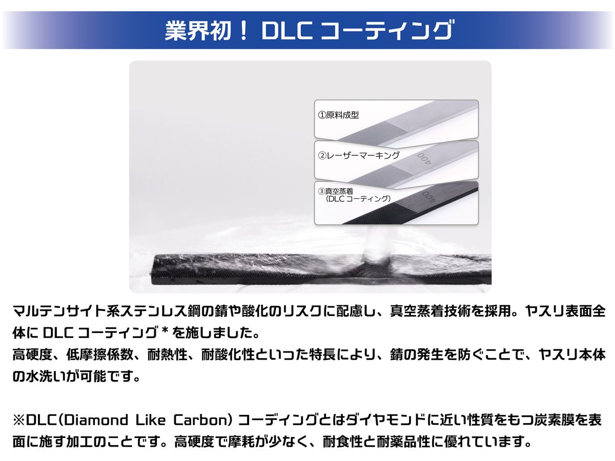 ヤスリ表面全体にDLCコーティング*を施しました。