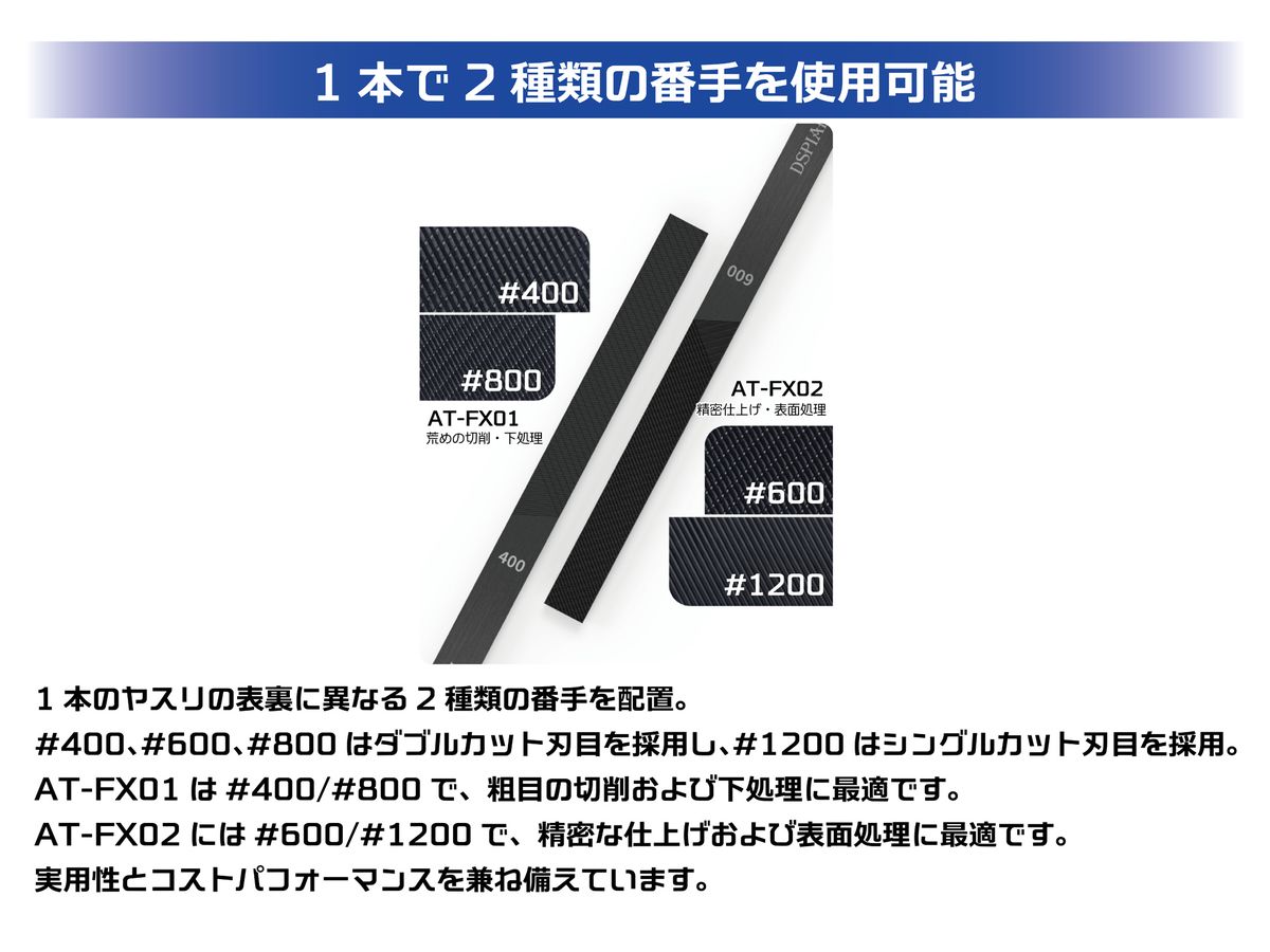 AT-FX01は#400/#800で、粗目の切削および下処理に最適です。