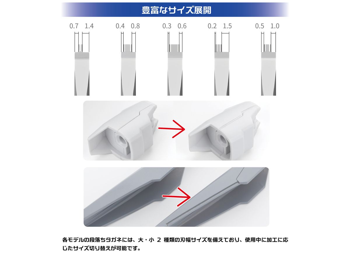 各モデルの段落ちタガネには、大・小2種類の刃幅サイズを備えており、 使用中に加工に応じたサイズ切り替えが可能です。