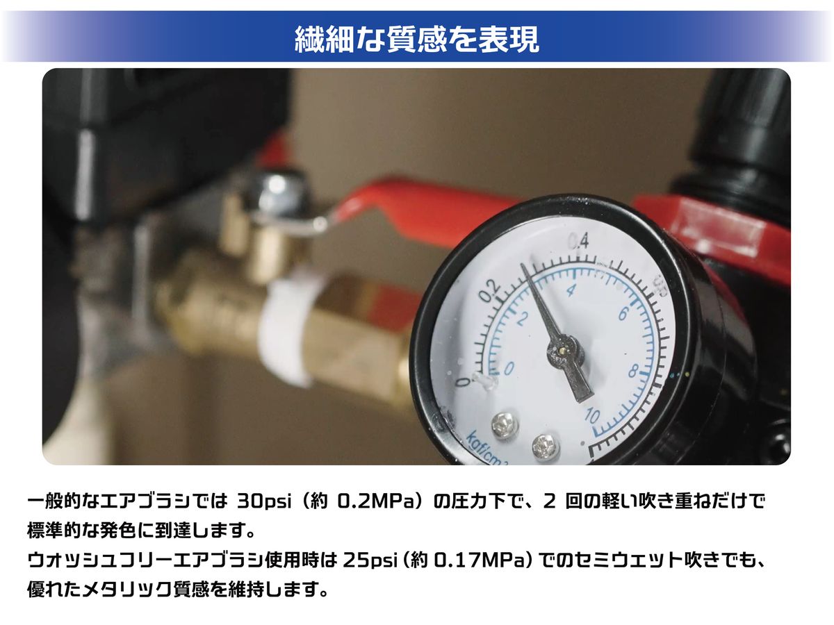 ウォッシュフリーエアブラシ使用時は25psi(約0.17MPa)でのセミウェット吹きでも、優れたメタリック質感を維持します。