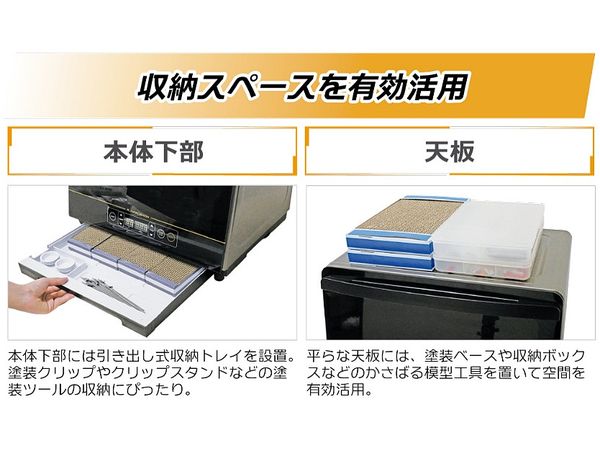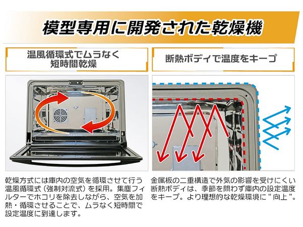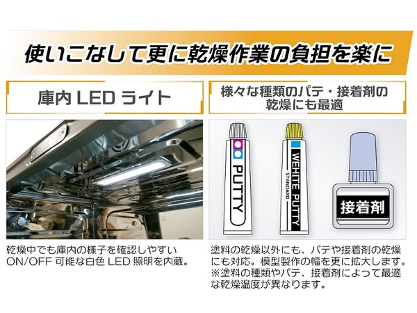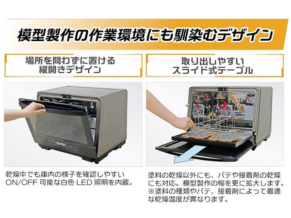 塗料の乾燥以外にも、パテや接着剤の乾燥にも対応。模型製作の幅を更に拡大します。
