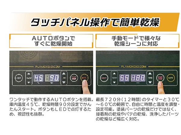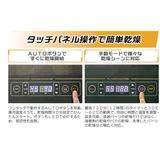 タッチパネルのAUTOボタンを押せば、庫内温度45°C・乾燥時間90分設定でかんたんに乾燥開始。