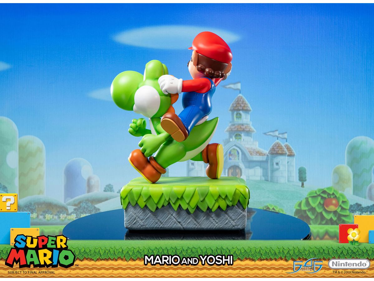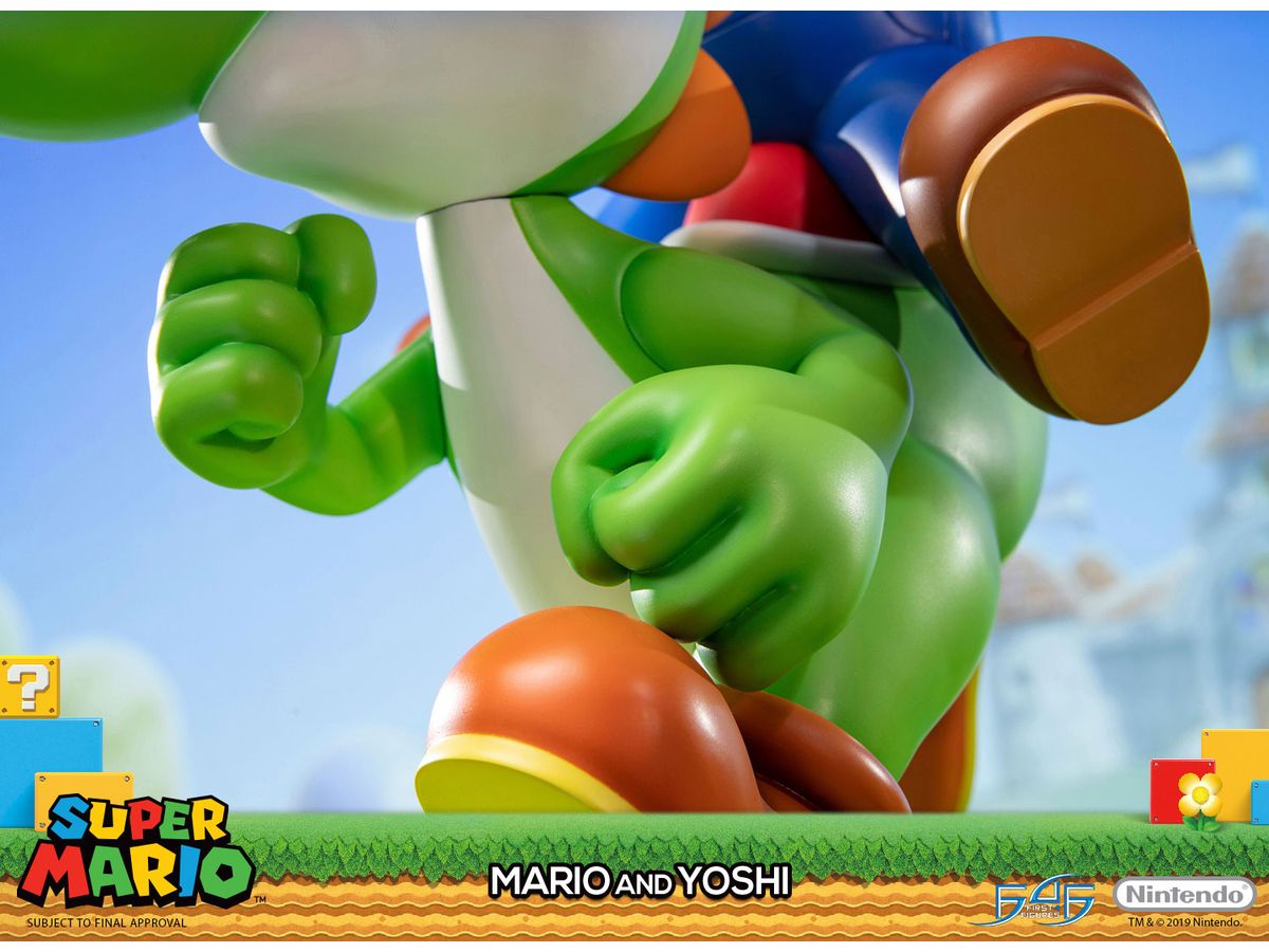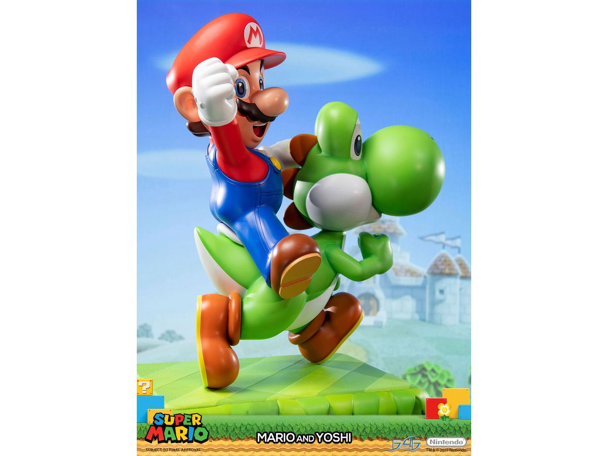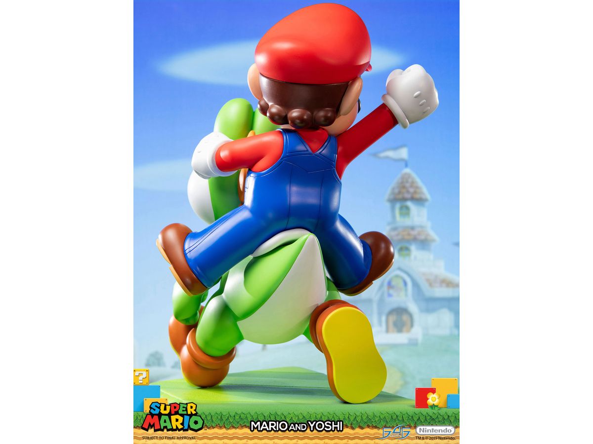 疾走するヨッシーの背中に乗り、右手を挙げてGOGO状態のマリオを、全高約48センチ(台座含む)でスタチュー化。
