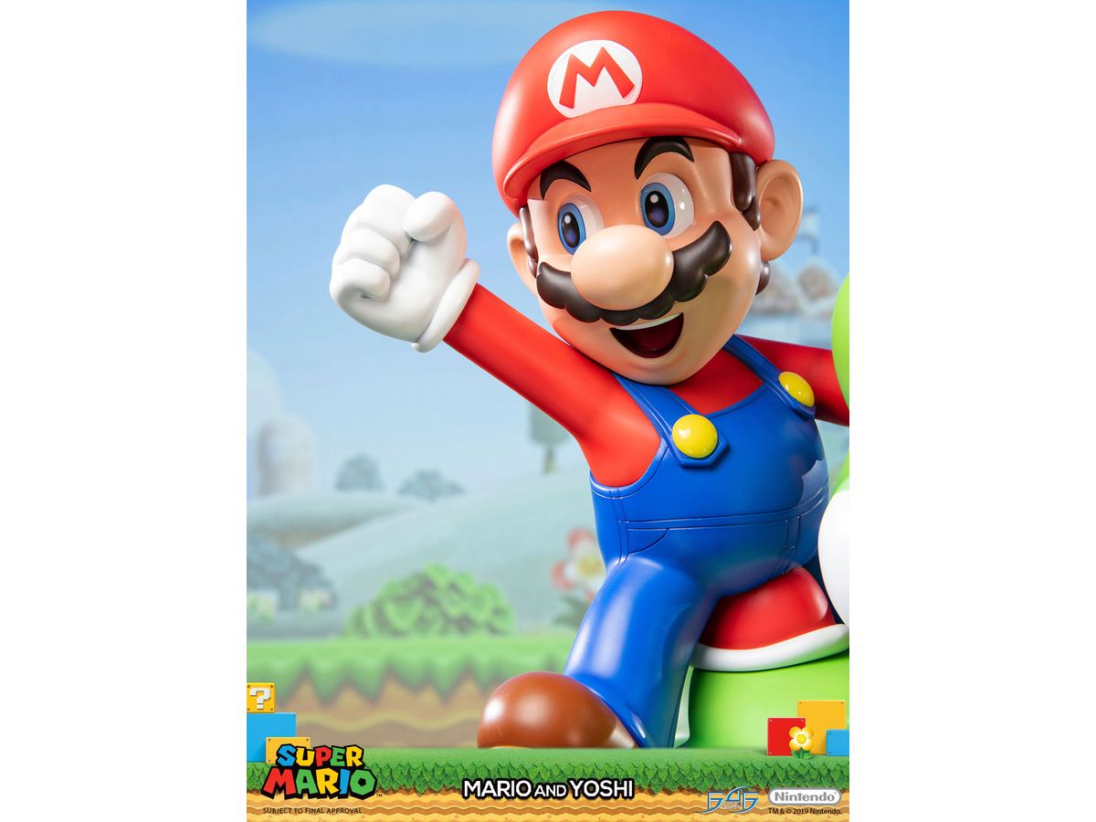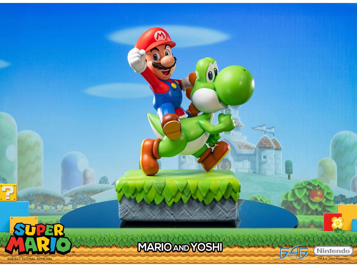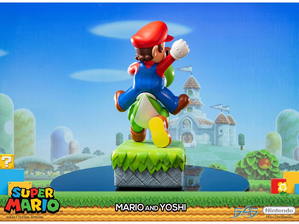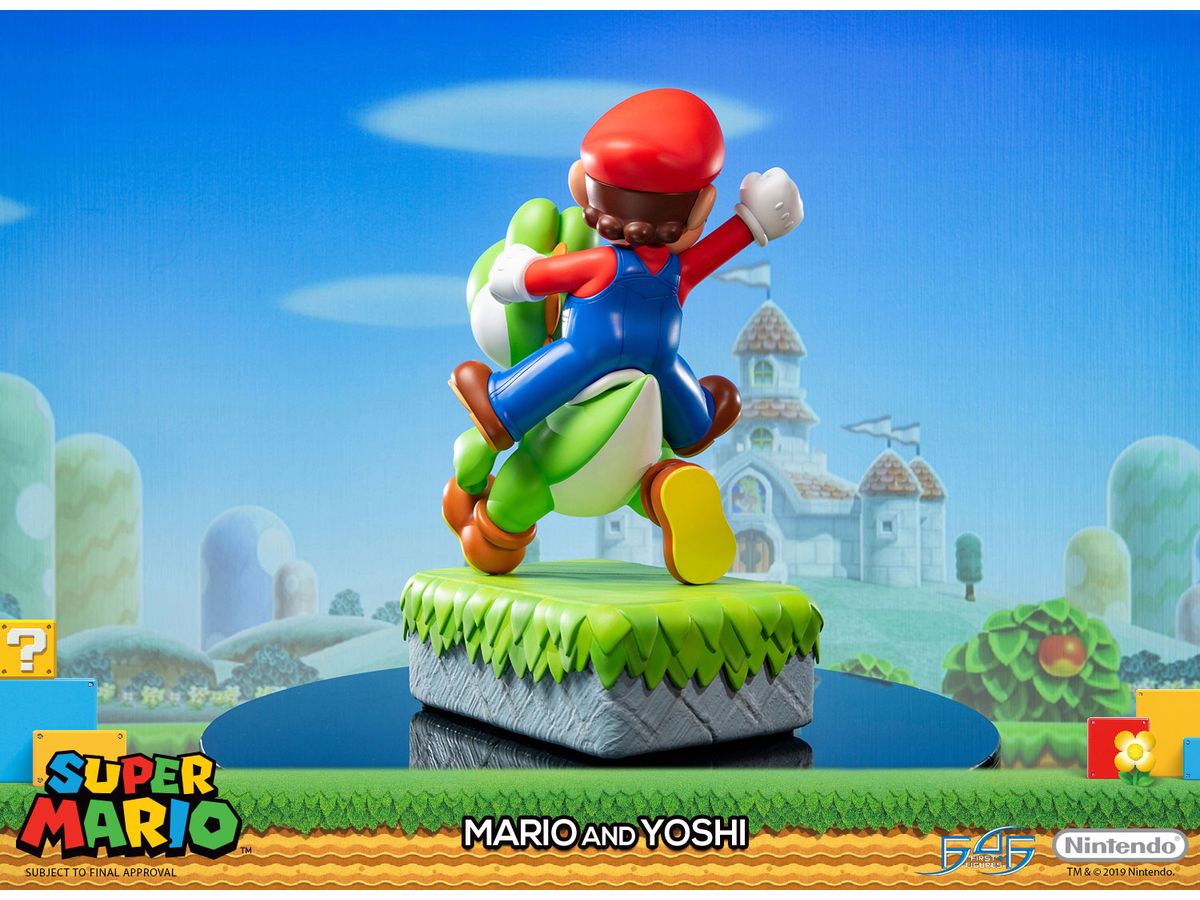 疾走するヨッシーの背中に乗り、右手を挙げてGOGO状態のマリオを、全高約48センチ(台座含む)でスタチュー化。