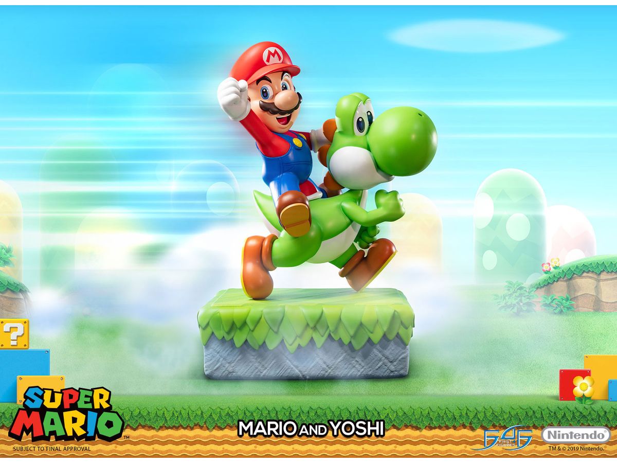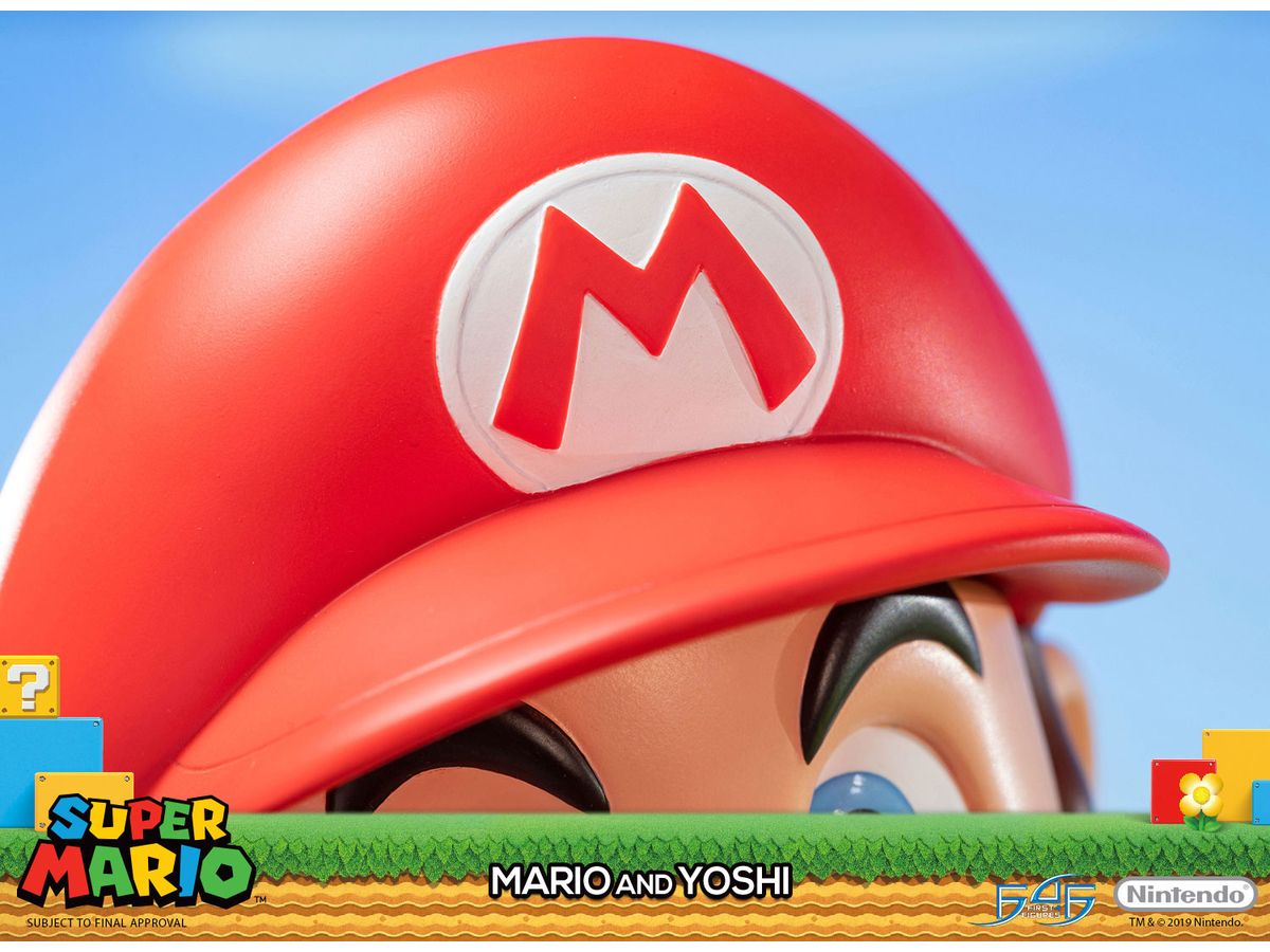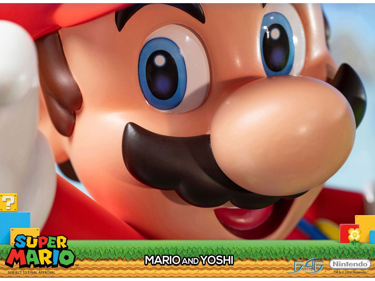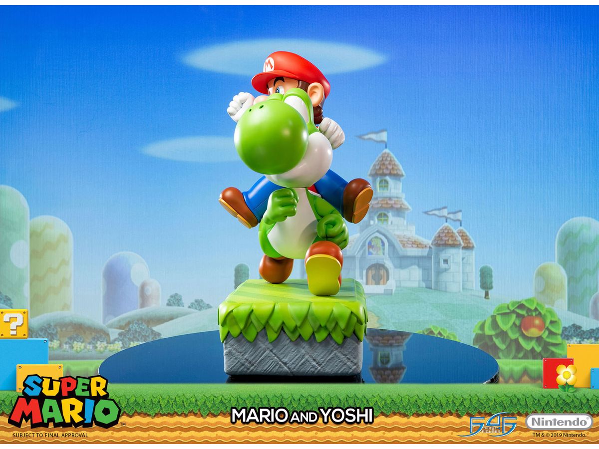 疾走するヨッシーの背中に乗り、右手を挙げてGOGO状態のマリオを、全高約48センチ(台座含む)でスタチュー化。